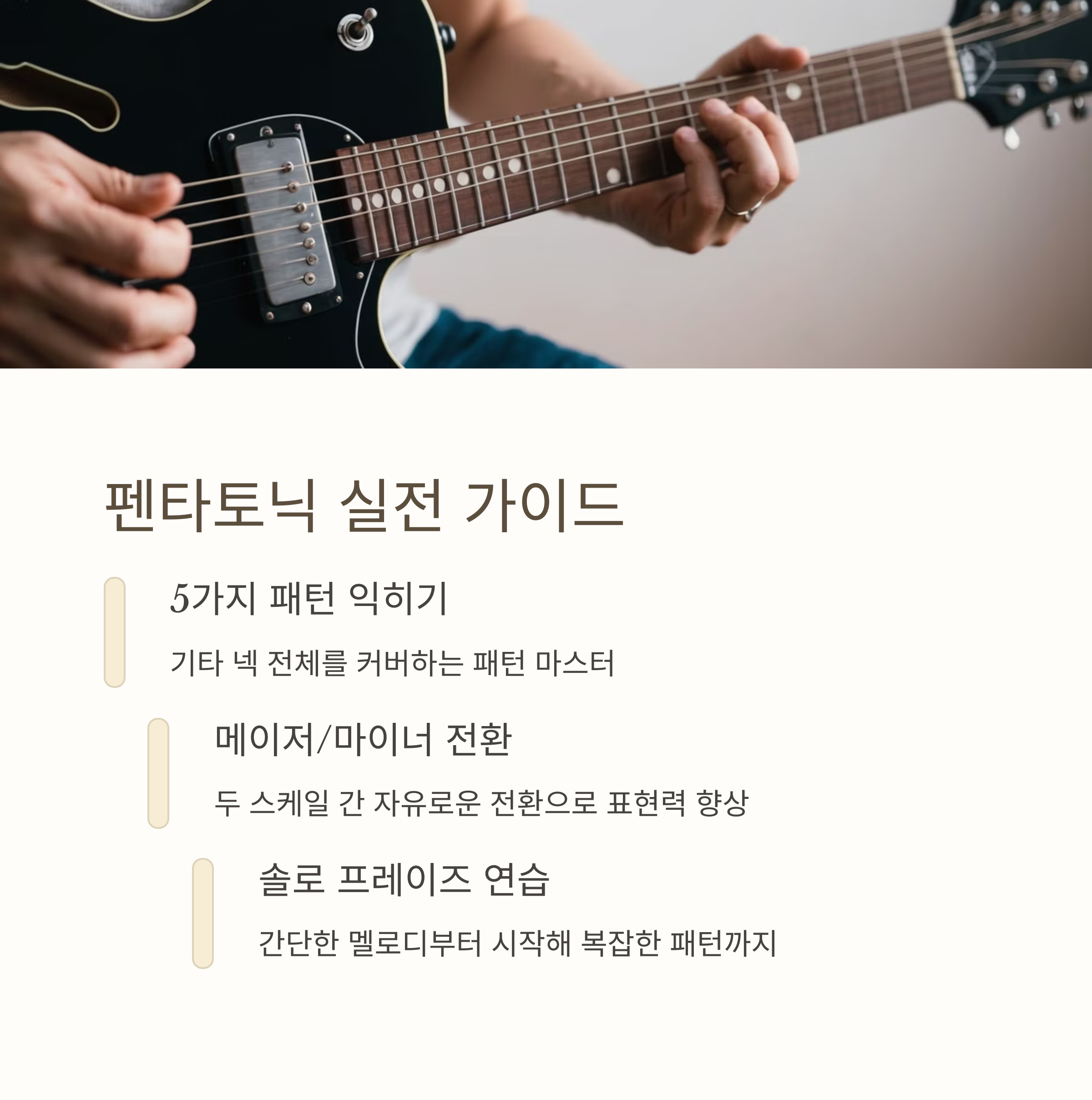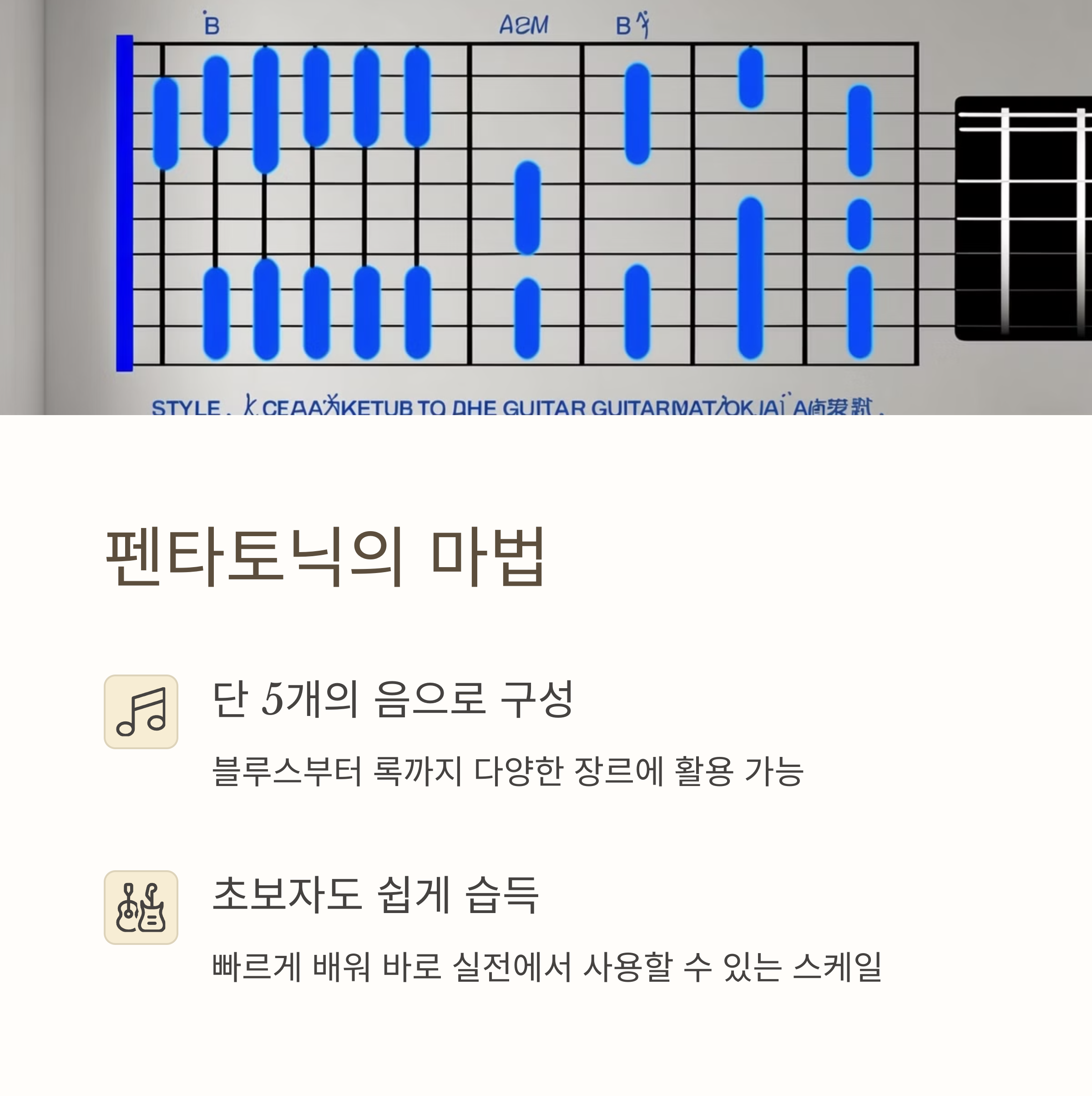 기타 솔로 연주의 첫걸음은 바로 스케일의 이해입니다. 특히 펜타토닉 스케일은 락, 블루스, 팝 등 다양한 장르에서 가장 기본적으로 활용되며, 초보자도 쉽게 접근할 수 있는 구조를 가지고 있습니다. 이 스케일의 형태를 연습하고 손에 익히는 것은 나중에 감성적인 애드립을 가능하게 만드는 중요한 기초가 됩니다. 매일 일정한 시간을 정해 반복적으로 연습한다면, 어느 순간 자연스럽게 손가락이 스케일 위를 흐르듯 움직이게 될 것입니다.