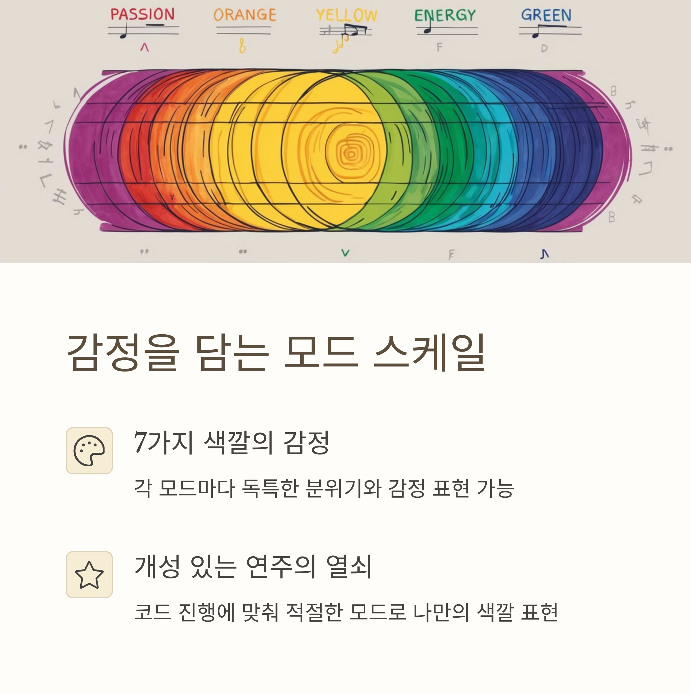 펜타토닉이나 블루스 스케일에 어느 정도 익숙해지고 나면 모드 스케일을 도전해보는 것이 좋습니다. 기본 코드를 이해한 후 배우면 더 효과적입니다.