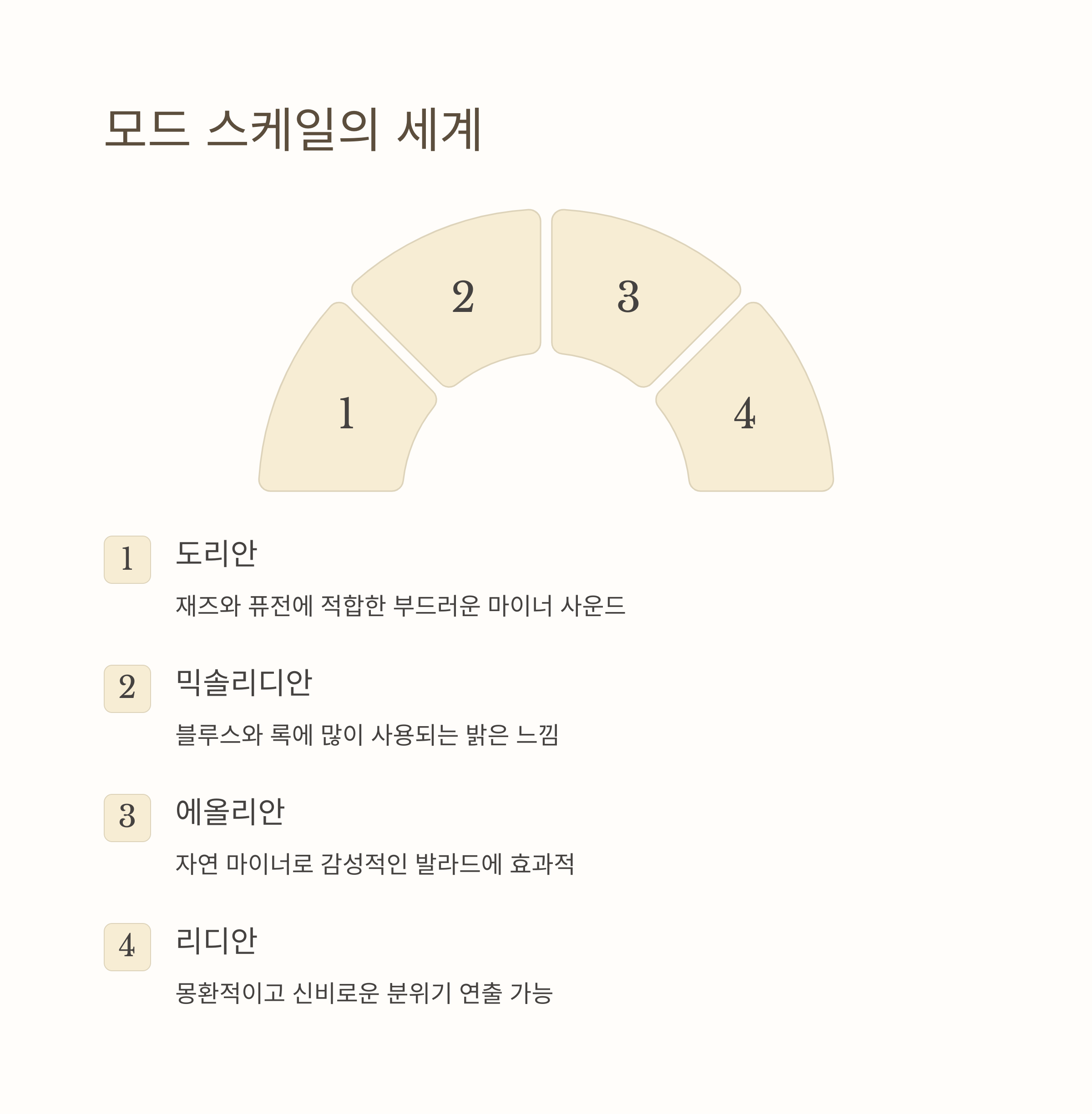 기타 스케일은 단순한 이론이 아니라 자유로운 표현의 도구입니다. 다양한 스케일을 익히되, 각각의 스케일이 지닌 느낌과 뉘앙스를 이해하는 것이 중요합니다. 모드 스케일은 다소 어렵게 느껴질 수 있지만, 각 모드가 가진 고유한 분위기를 익히고, 실제 곡에서 어떤 배경 코드에 어울리는지를 파악하는 훈련을 반복하면 점차 자연스럽게 연주에 녹아들게 됩니다. 결국 중요한 것은 ‘실전 응용’이며, 백킹 트랙에 맞춰 꾸준히 감각을 기르는 것이 가장 빠른 길입니다.