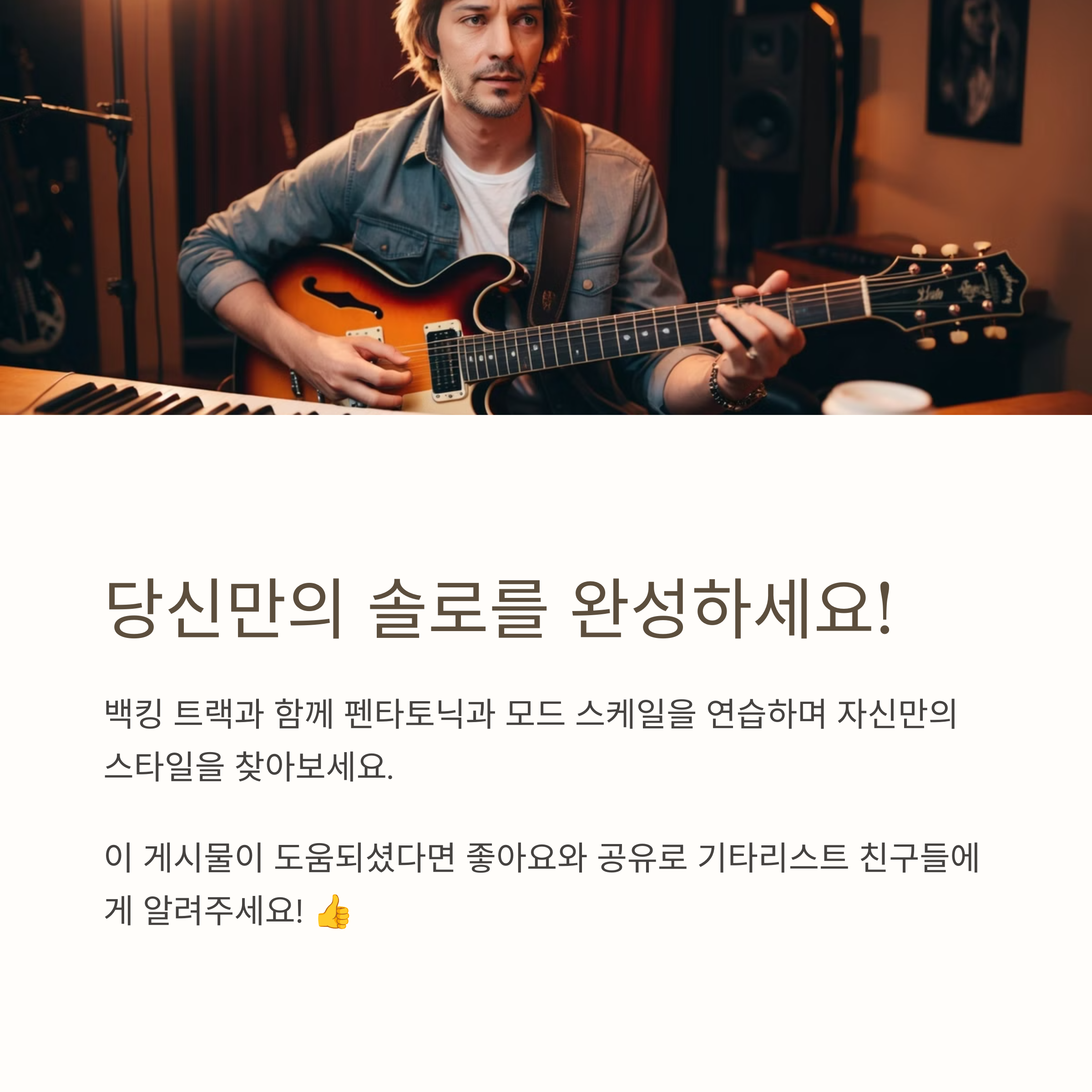 기타 솔로 연주는 어느 날 갑자기 실력이 향상되는 것이 아니라, 매일 꾸준한 연습과 반복을 통해 조금씩 쌓여가는 결과입니다. 오늘 배운 펜타토닉, 블루스, 모드 스케일은 단순히 외우는 것이 아니라, 자신만의 감정과 느낌을 담는 도구라는 점을 기억하세요. 스케일 하나하나를 연습할 때마다 새로운 표현이 가능하다는 기대감을 가지고 접근하면, 기타 솔로는 더 이상 어려운 영역이 아닙니다. 누구나 연주할 수 있고, 나만의 사운드를 만들 수 있습니다. 여러분이 이 글을 통해 음악적 자유를 더욱 가까이 느끼시길 바랍니다.