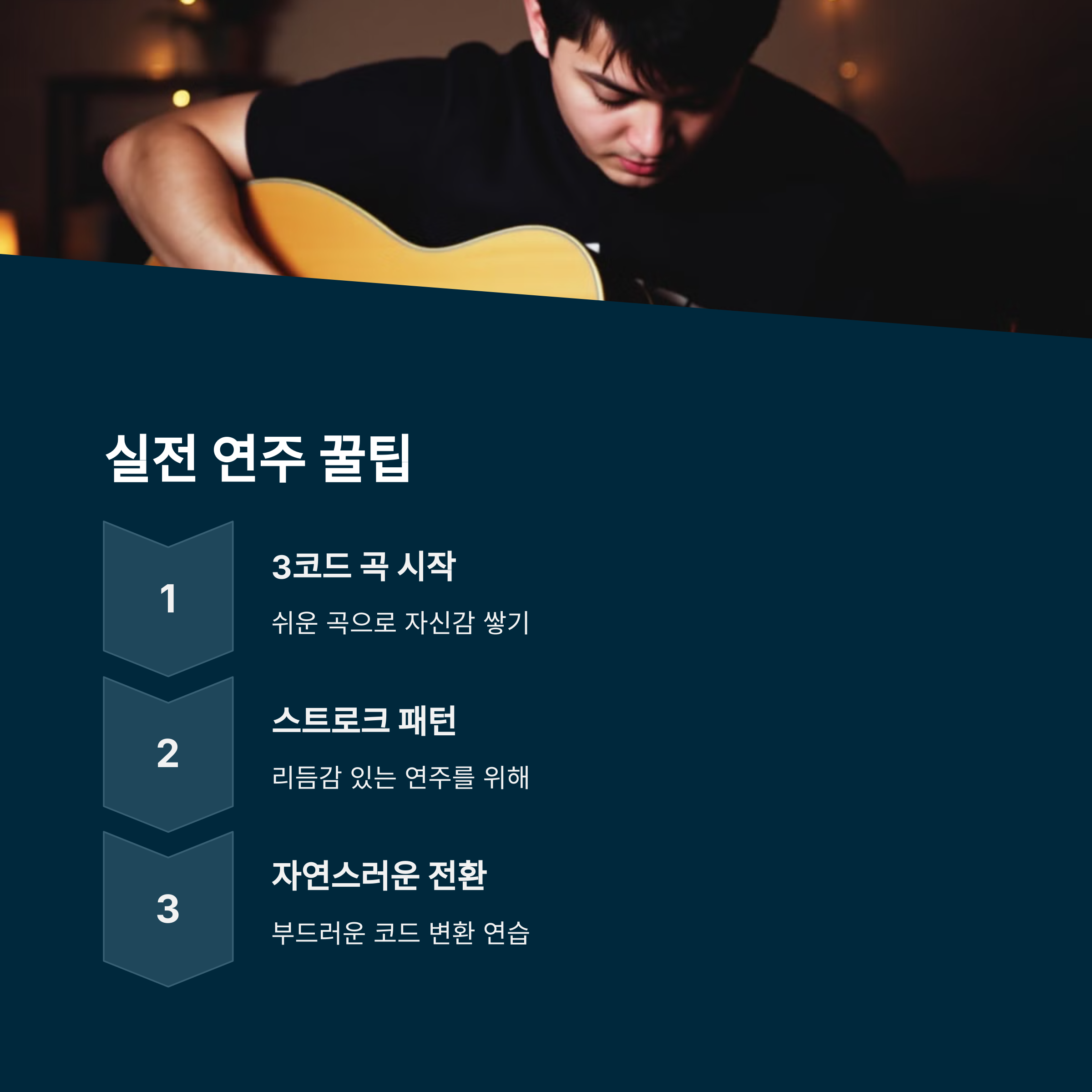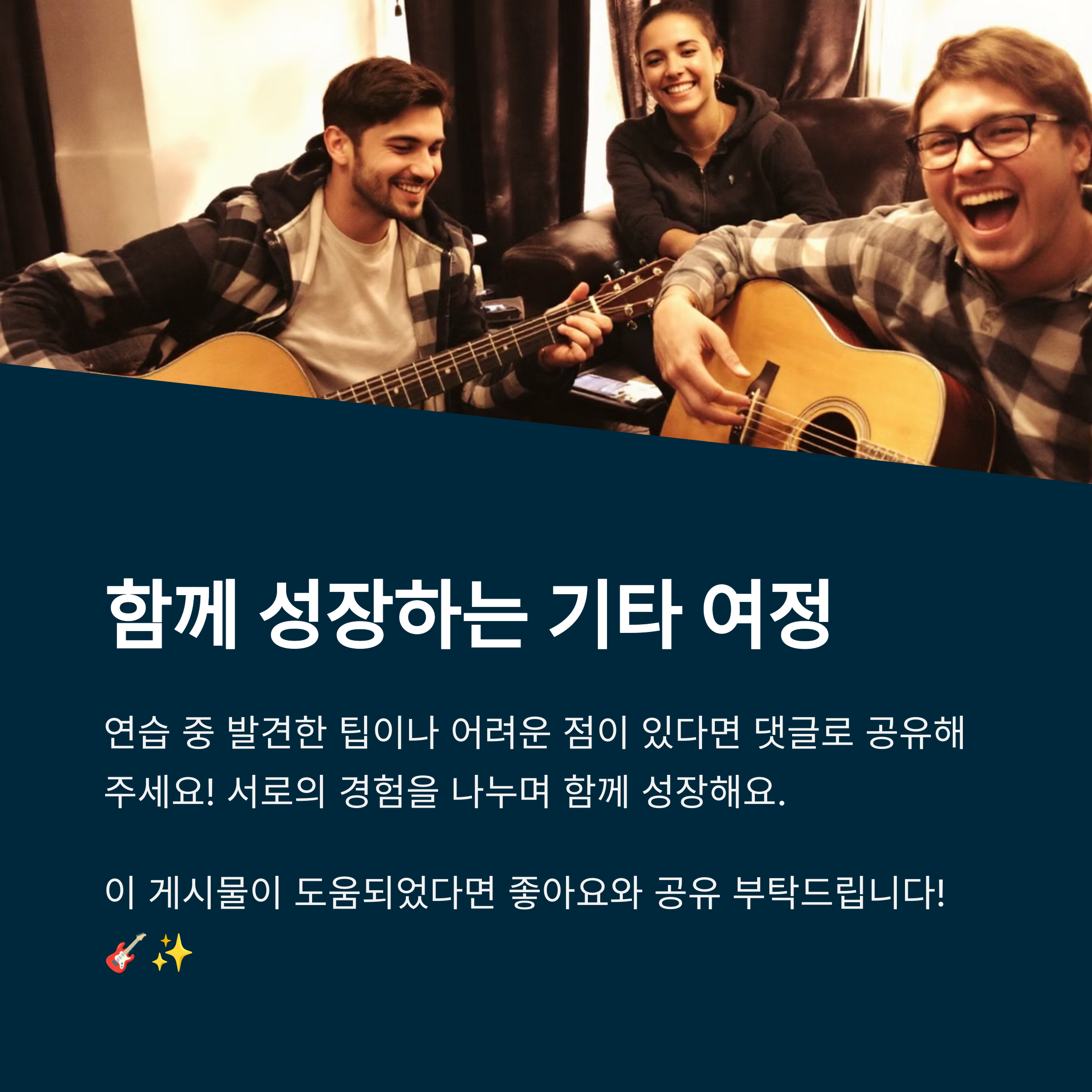 기타를 처음 배울 때 가장 어려웠던 점은 무엇인가요? 코드 전환을 쉽게 하는 본인만의 팁이 있다면 댓글로 공유해주세요! 여러분의 경험이 다른 사람들에게 큰 도움이 될 수 있습니다.