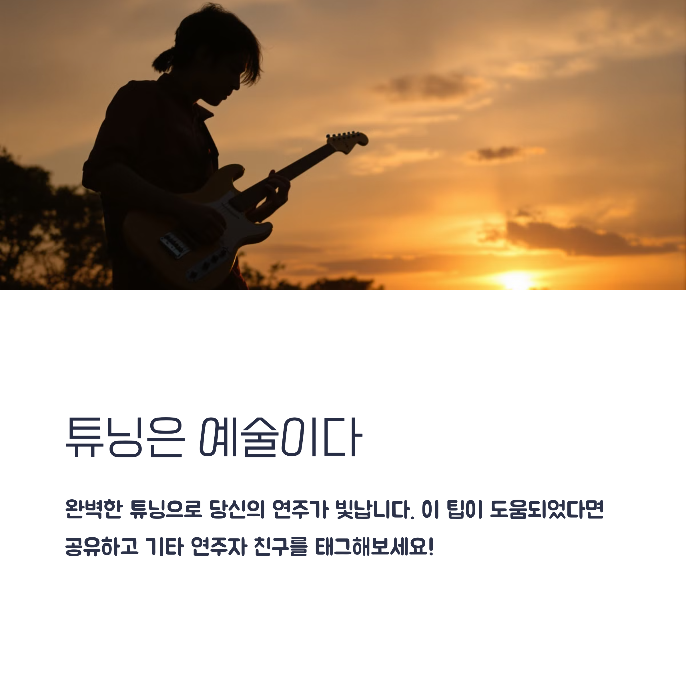 | 매 연습 전 튜닝 체크는 필수 루틴입니다. | 튜너가 없을 땐 피아노나 앱을 활용하세요. | 락, 블루스에서 자주 사용되는 튜닝 방식입니다. |