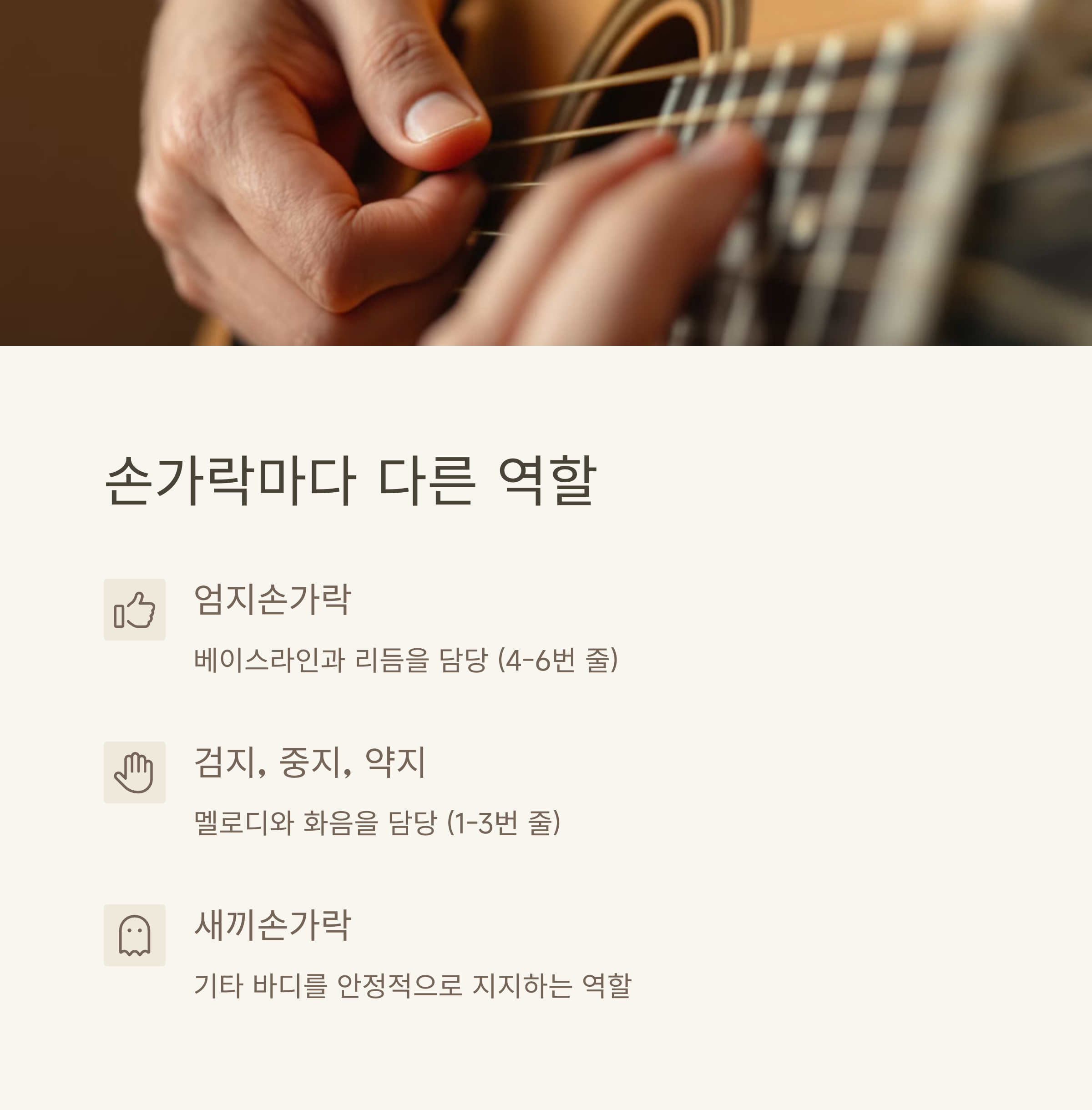 손가락으로 멜로디와 리듬을 동시에 연주 | 엄지: 베이스 / 검지~약지: 고음 현 담당 | 코드 반복과 리듬 유지 패턴 연습 |