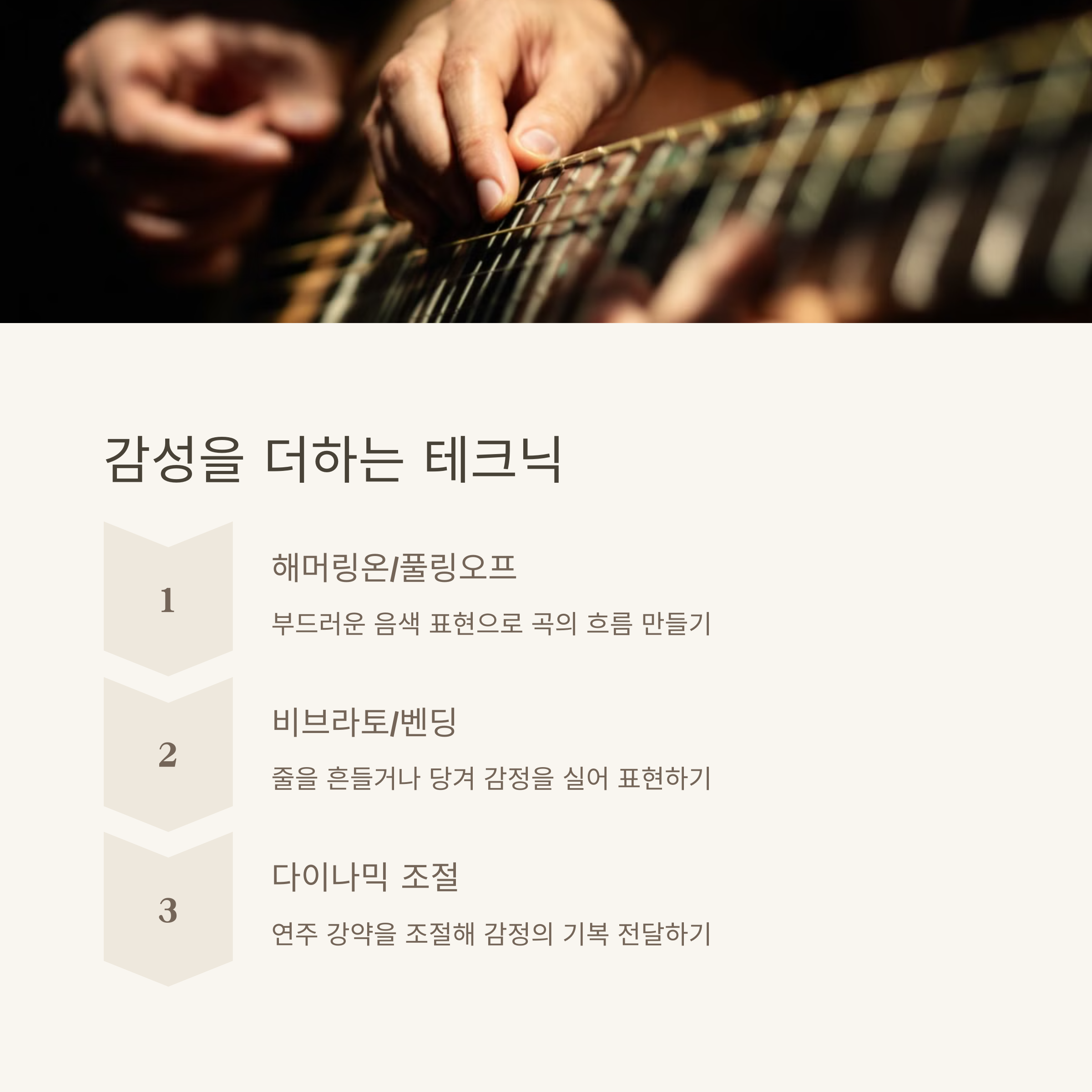 | 솔로 연주에 적합한 표현 기법 | 손가락 배분에 따른 연주 안정성 확보 | 짧은 구간 반복→실전곡 적용 |