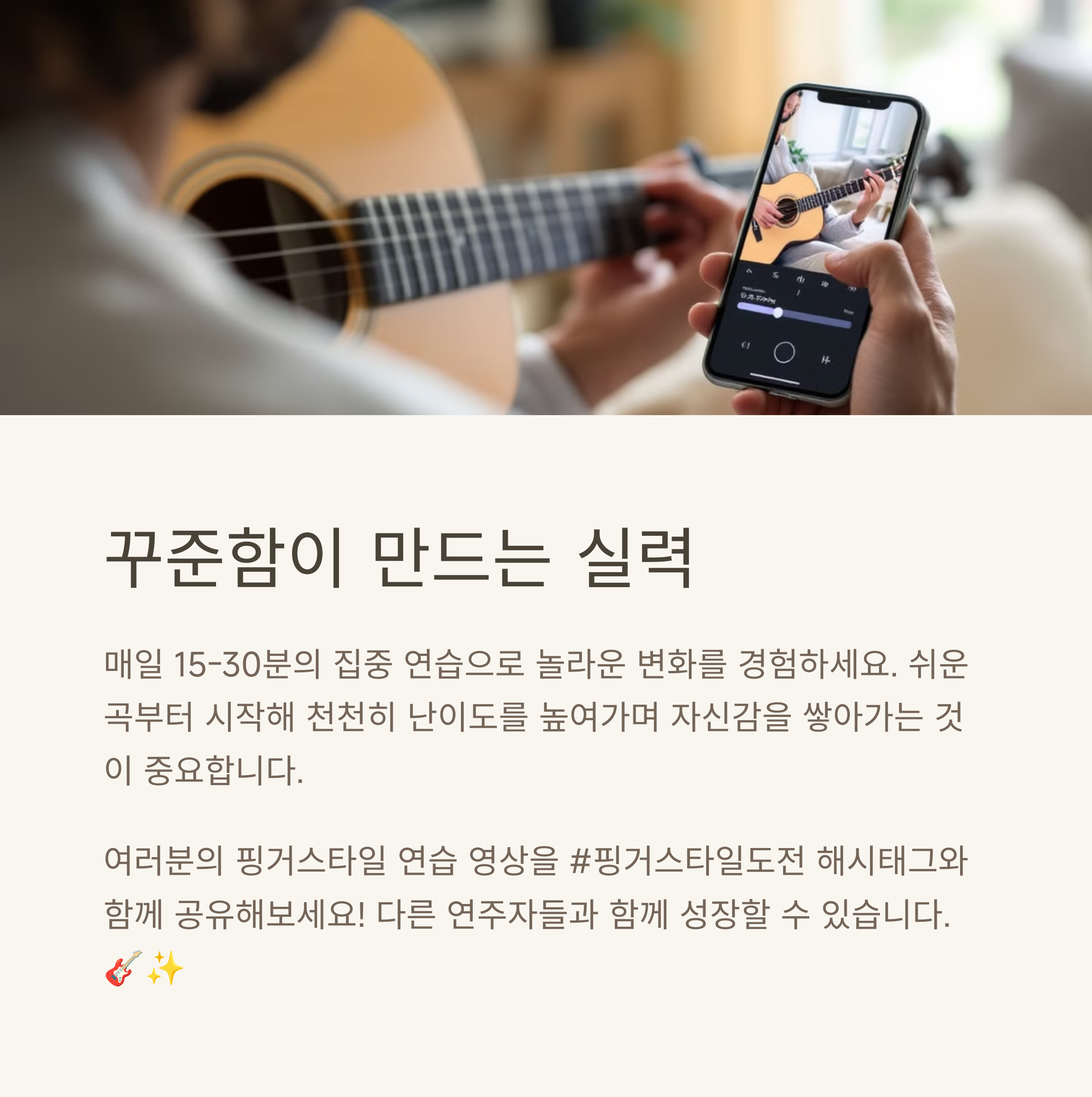 기타 핑거스타일은 처음에는 다소 어려울 수 있지만, 그 안에 담긴 표현력과 감성은 매우 매력적입니다. 코드 위에 멜로디를 얹고, 혼자서도 풍부한 곡의 분위기를 만들어낼 수 있는 핑거스타일은 여러분의 음악 인생에 새로운 활력을 줄 수 있습니다. 중요한 건 꾸준함이며, 매일 10분이라도 반복한다면 어느새 손가락이 멜로디를 이야기하는 날이 올 것입니다. 오늘부터 하나씩 연습을 시작해보세요.