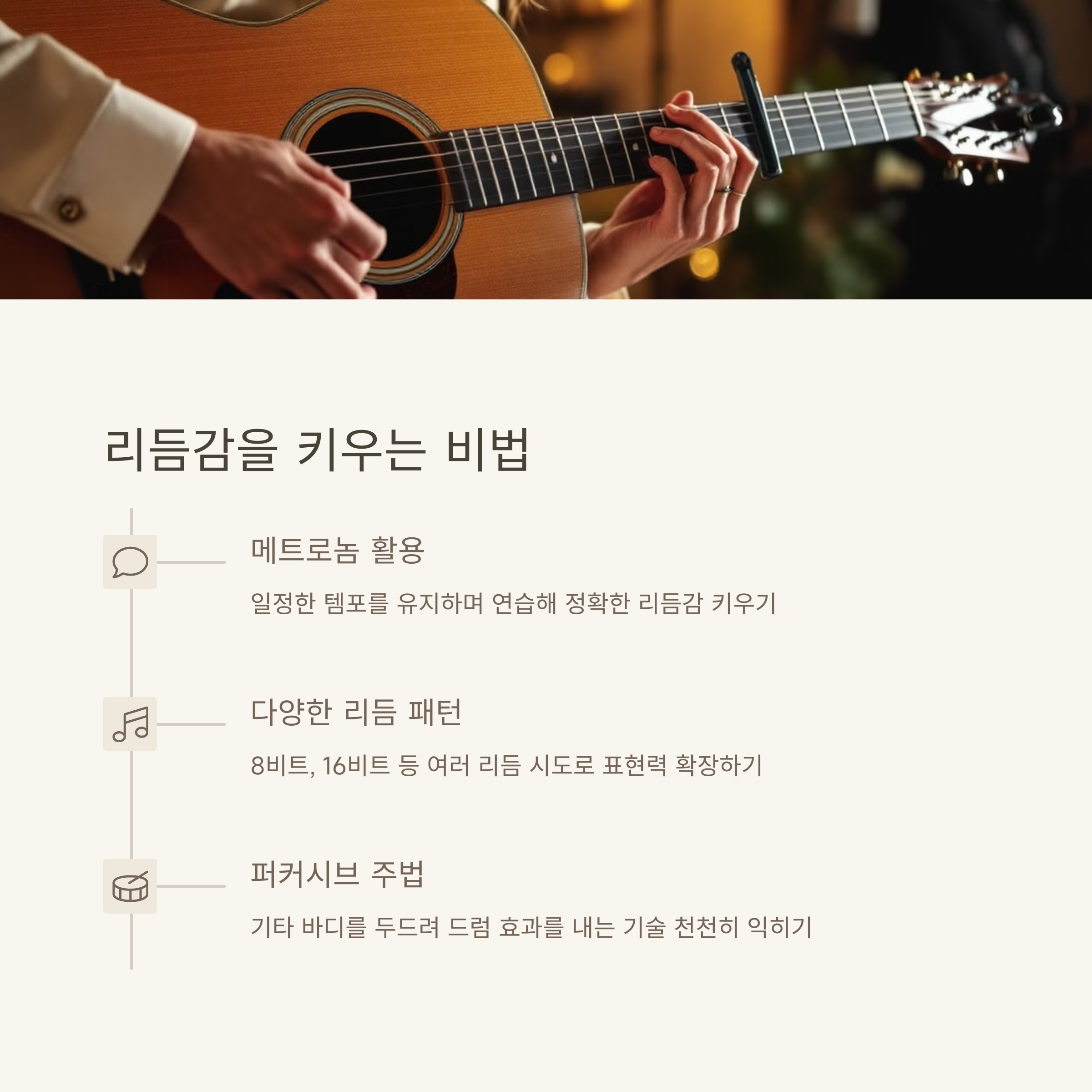 | 핑거스타일이란? | 손가락으로 멜로디와 리듬을 동시에 연주하는 방식입니다. |
