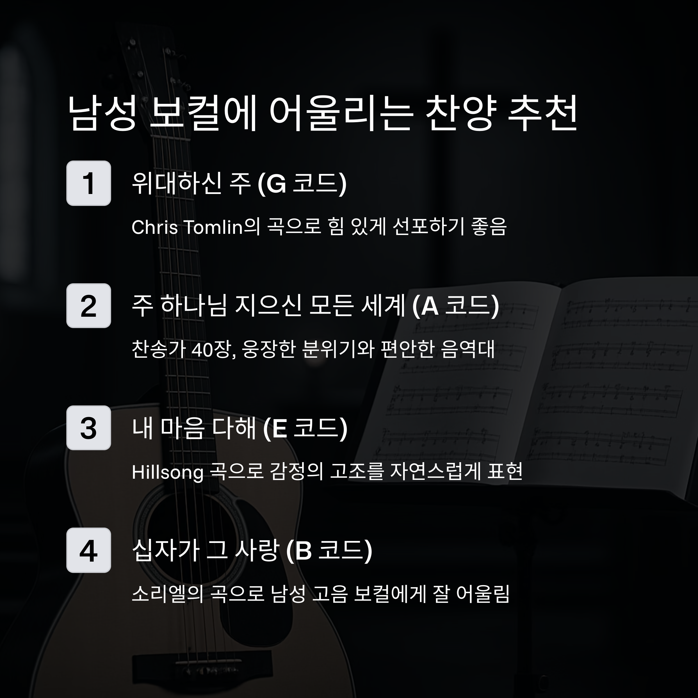 남성 보컬은 중저음에서 중고음까지 이르는 넓은 음역대를 갖고 있으며, 힘 있고 안정감 있는 찬양을 이끌기에 적합합니다. 이번 글에서는 남성 보컬용 찬양 코드 추천을 중심으로, 무리 없는 고백과 파워풀한 선포가 가능한 코드와 찬양들을 소개합니다.
