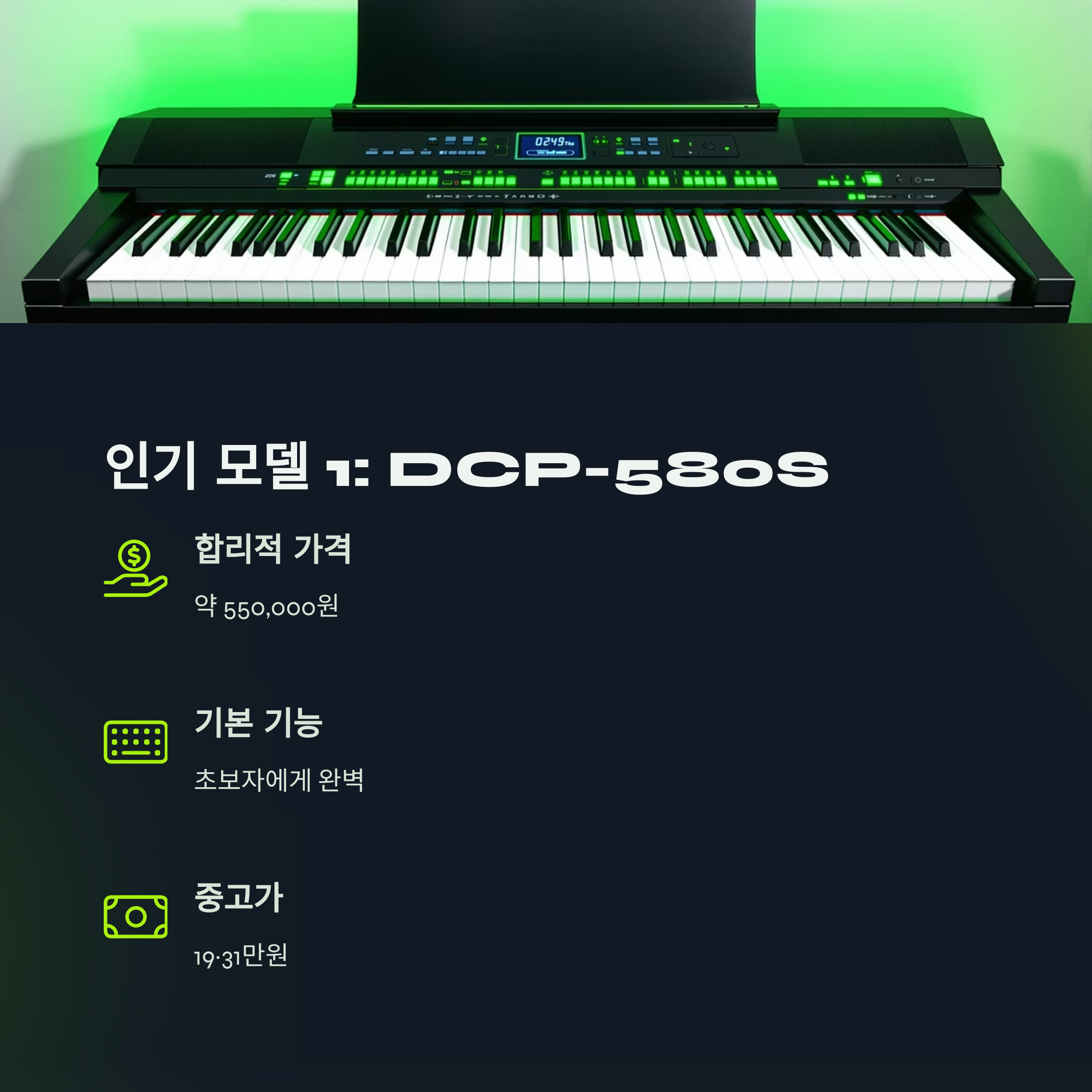 이처럼 다이나톤 DCP-580은 입문자뿐 아니라 취미 연주자와 교육용으로도 적합한 디지털 피아노입니다.