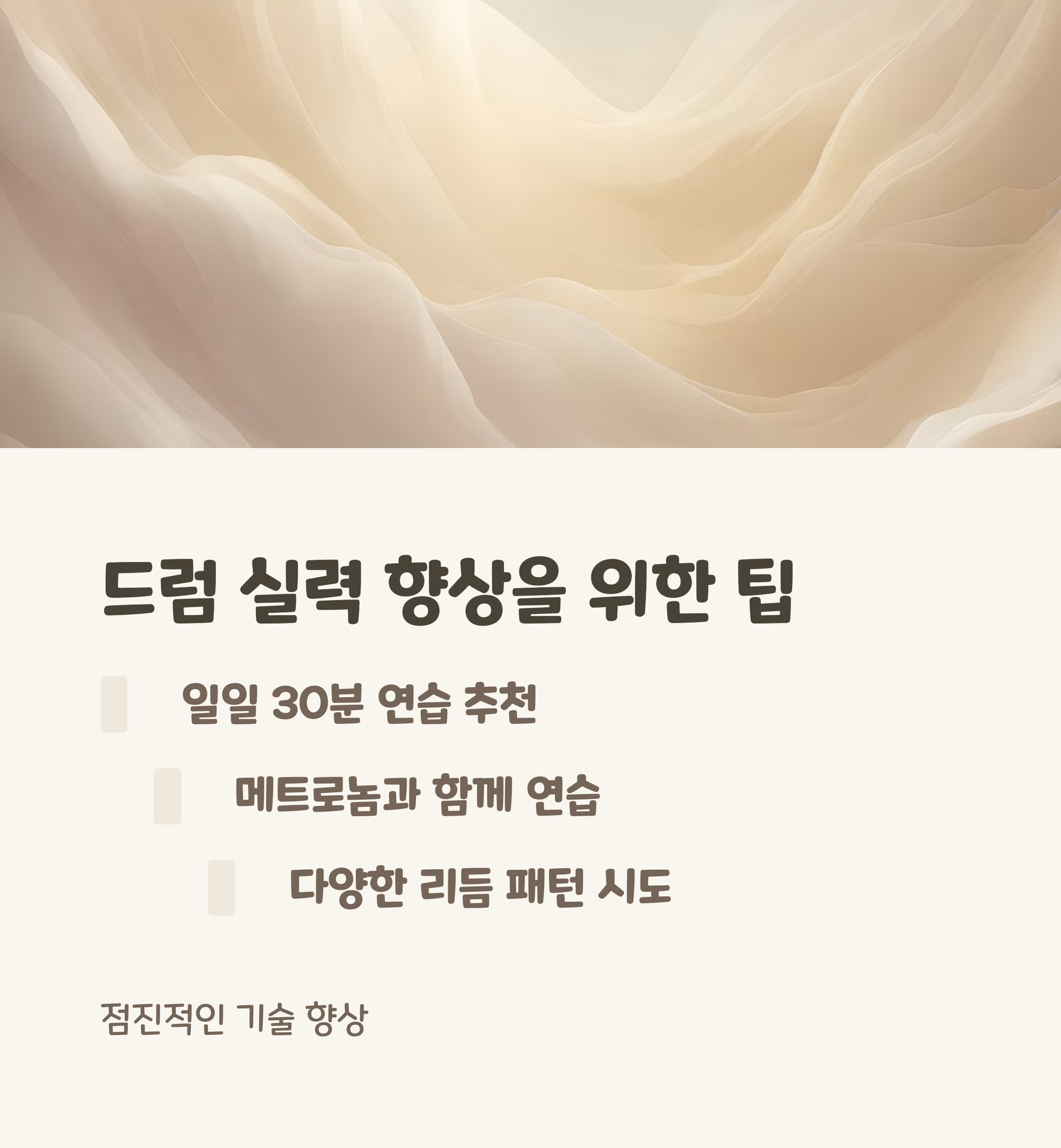 | 드럼 연습 패드란? | 실제 드럼과 비슷한 느낌으로 조용히 연습할 수 있는 도구 |