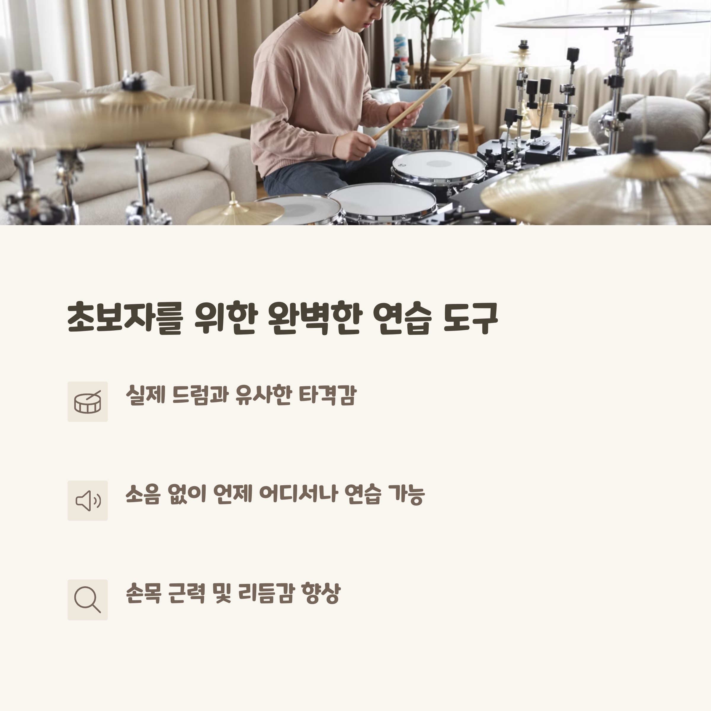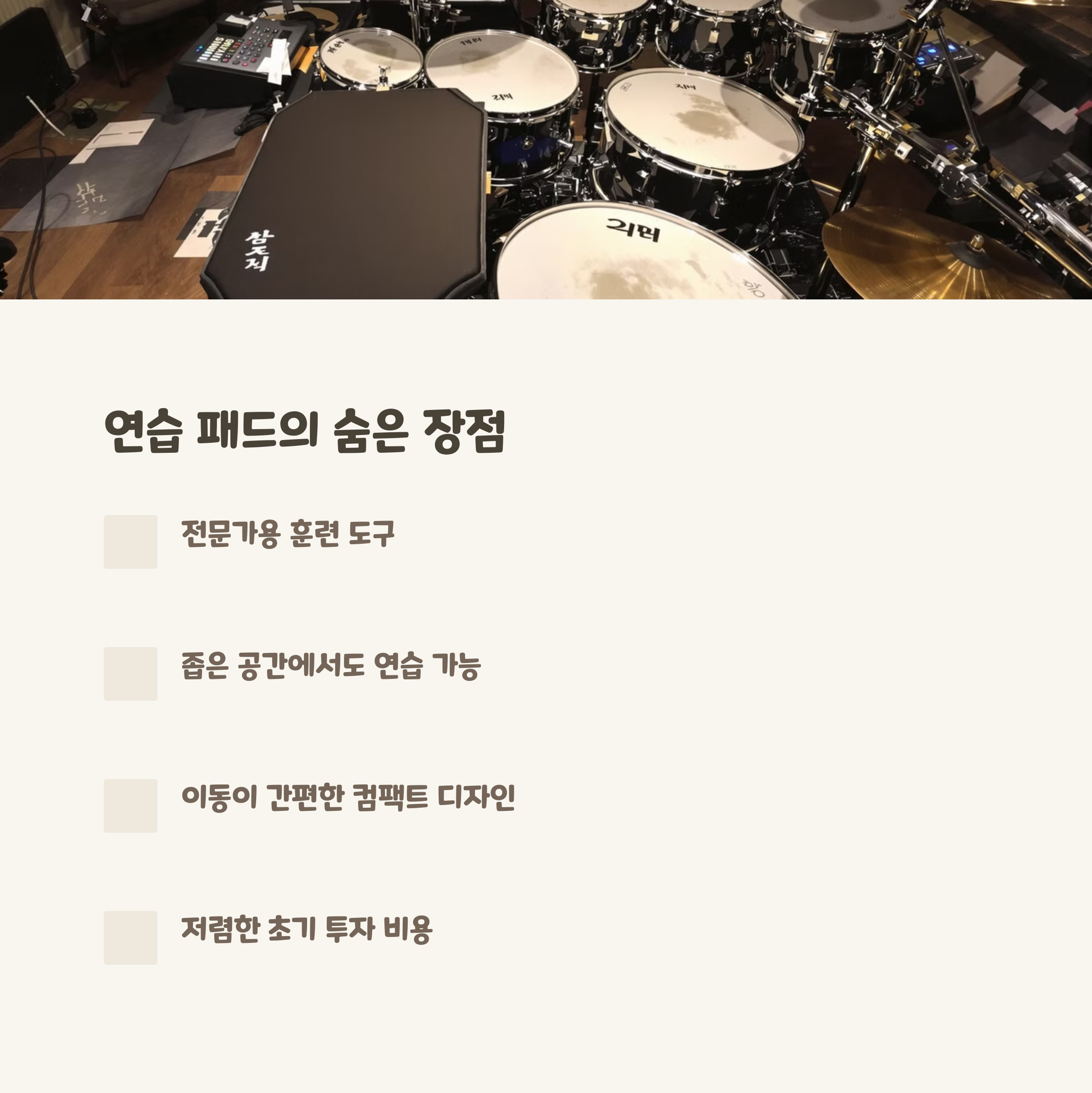 | 드럼 연습 패드란? | 실제 드럼과 비슷한 느낌으로 조용히 연습할 수 있는 도구 |