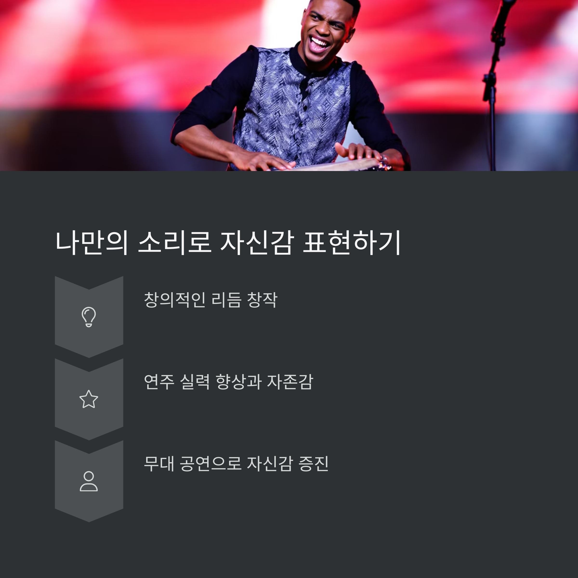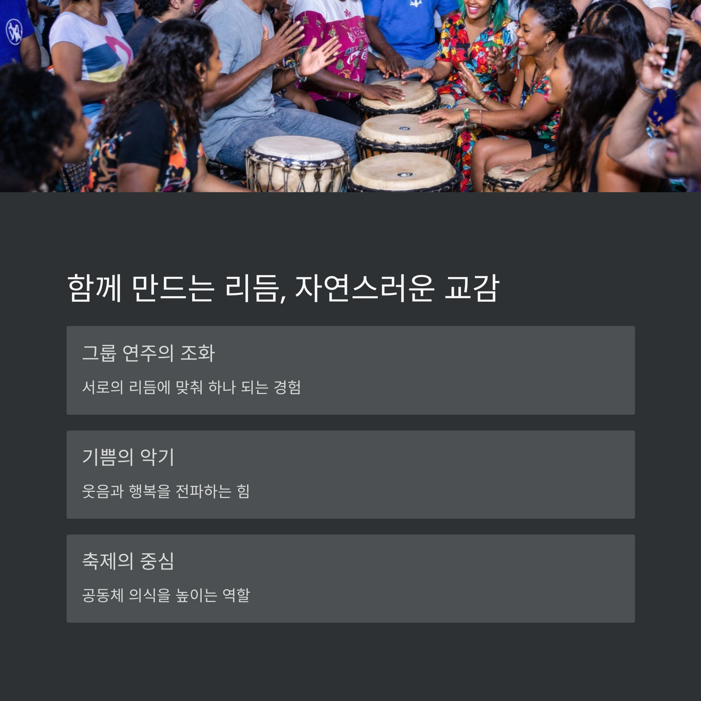| 마을 공동체 중심에서 전해져 내려온 북 | 영상 강의나 클래스 통해 쉽게 접근 가능 | 팀워크, 배려, 타이밍 감각을 자연스럽게 익힘 |