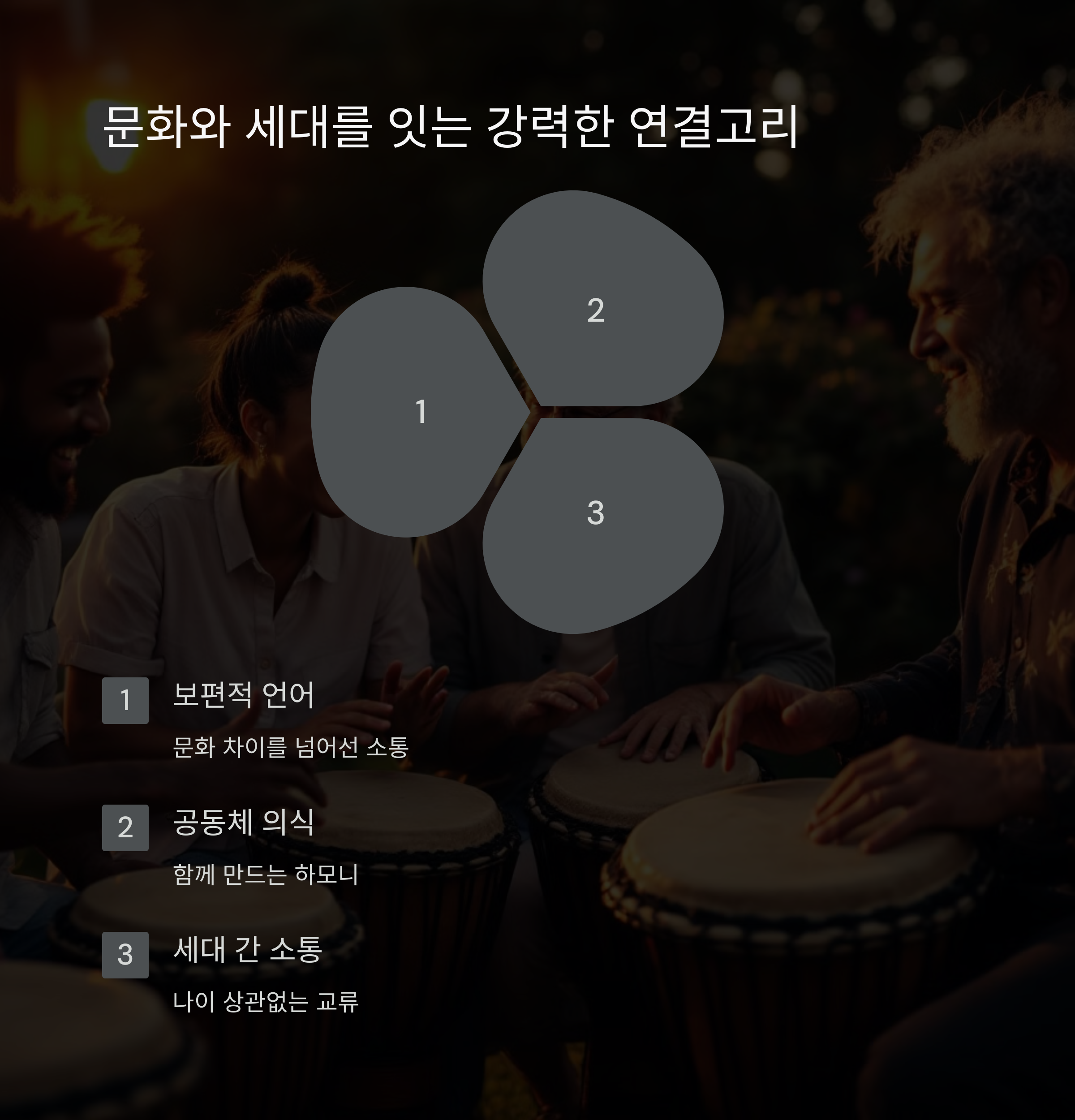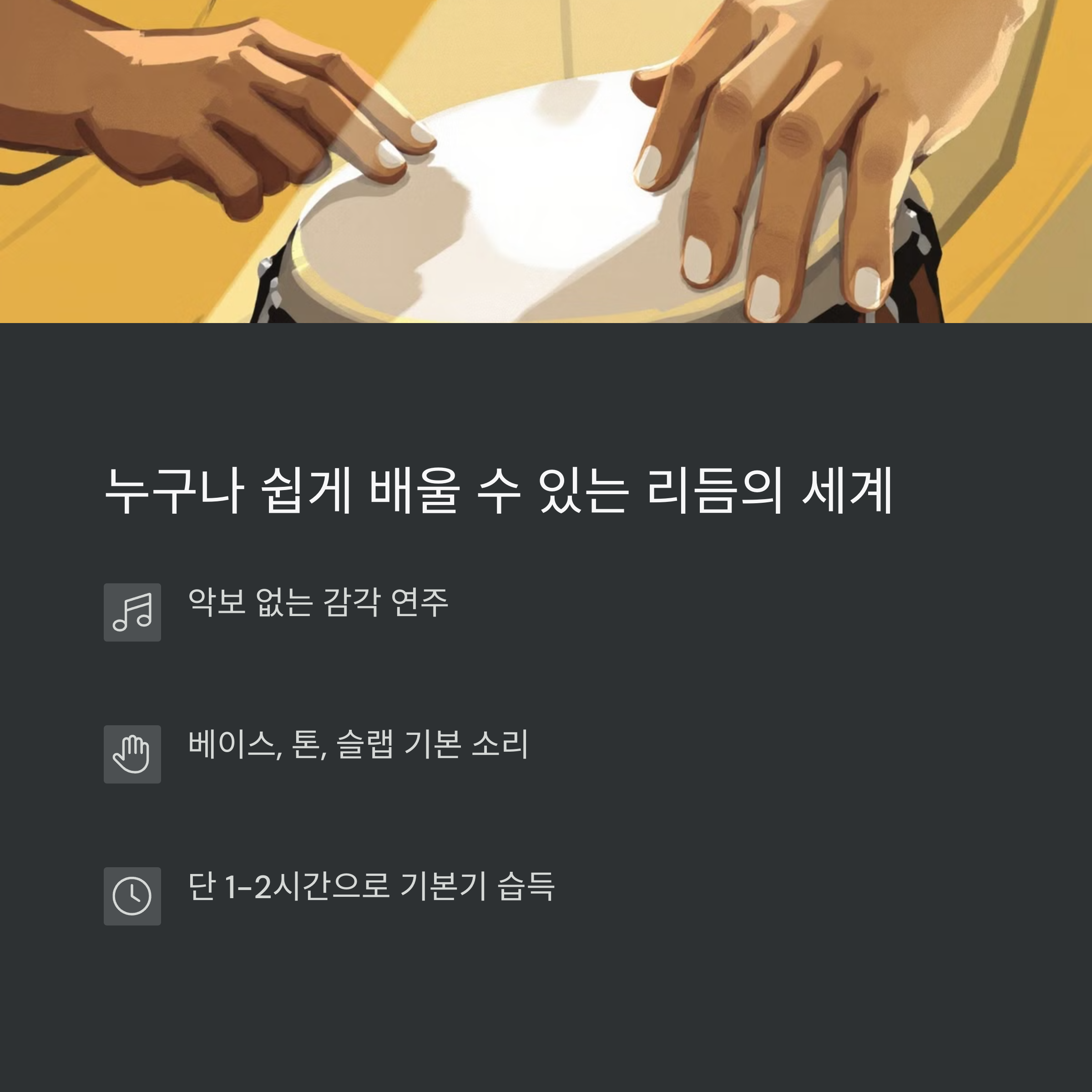 | 서아프리카 전통 타악기, 손으로 연주하는 북 | 악보 없이도 따라할 수 있는 리듬 학습 | 박자 맞추며 생기는 유대감과 화합의 에너지 |