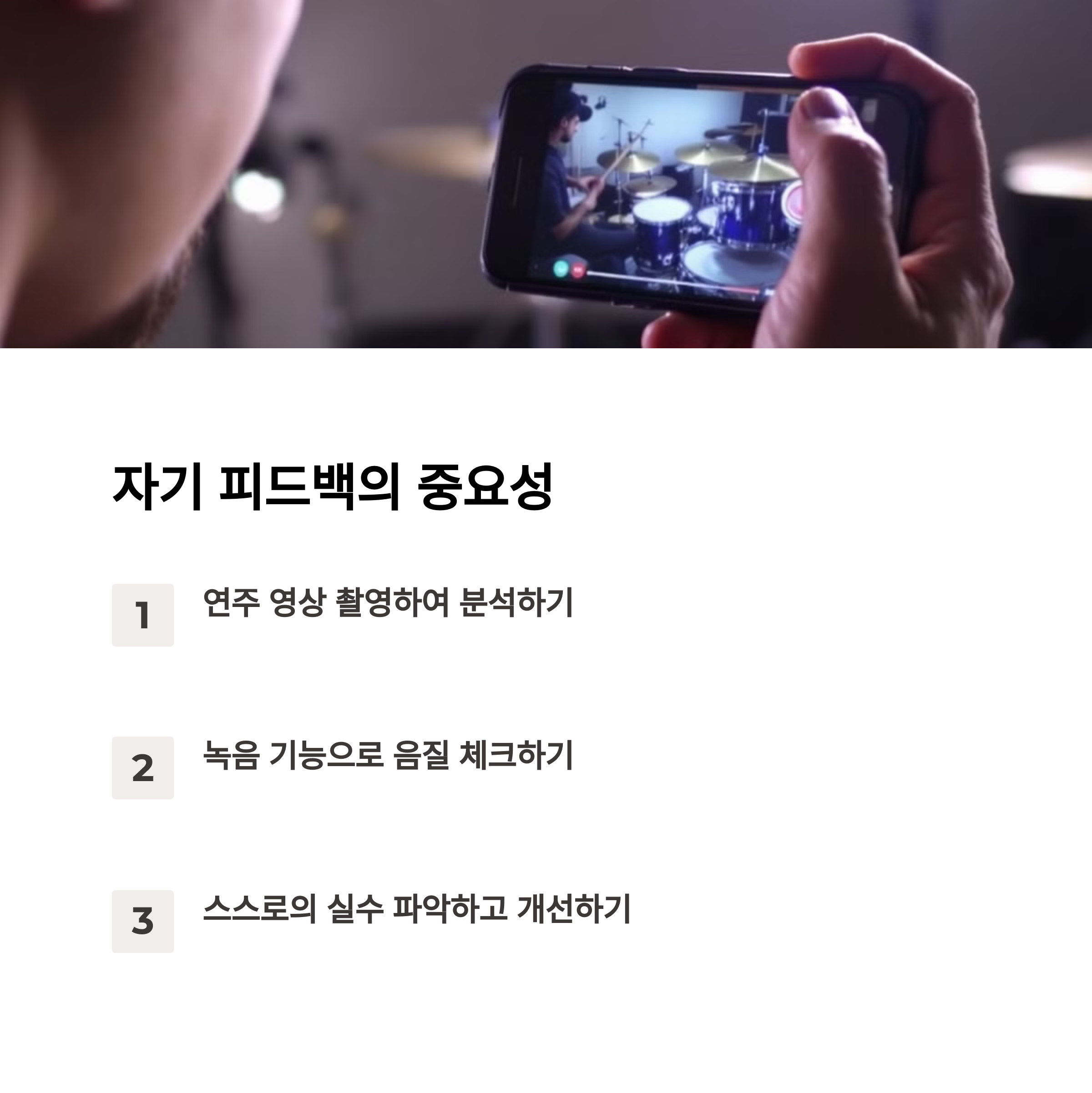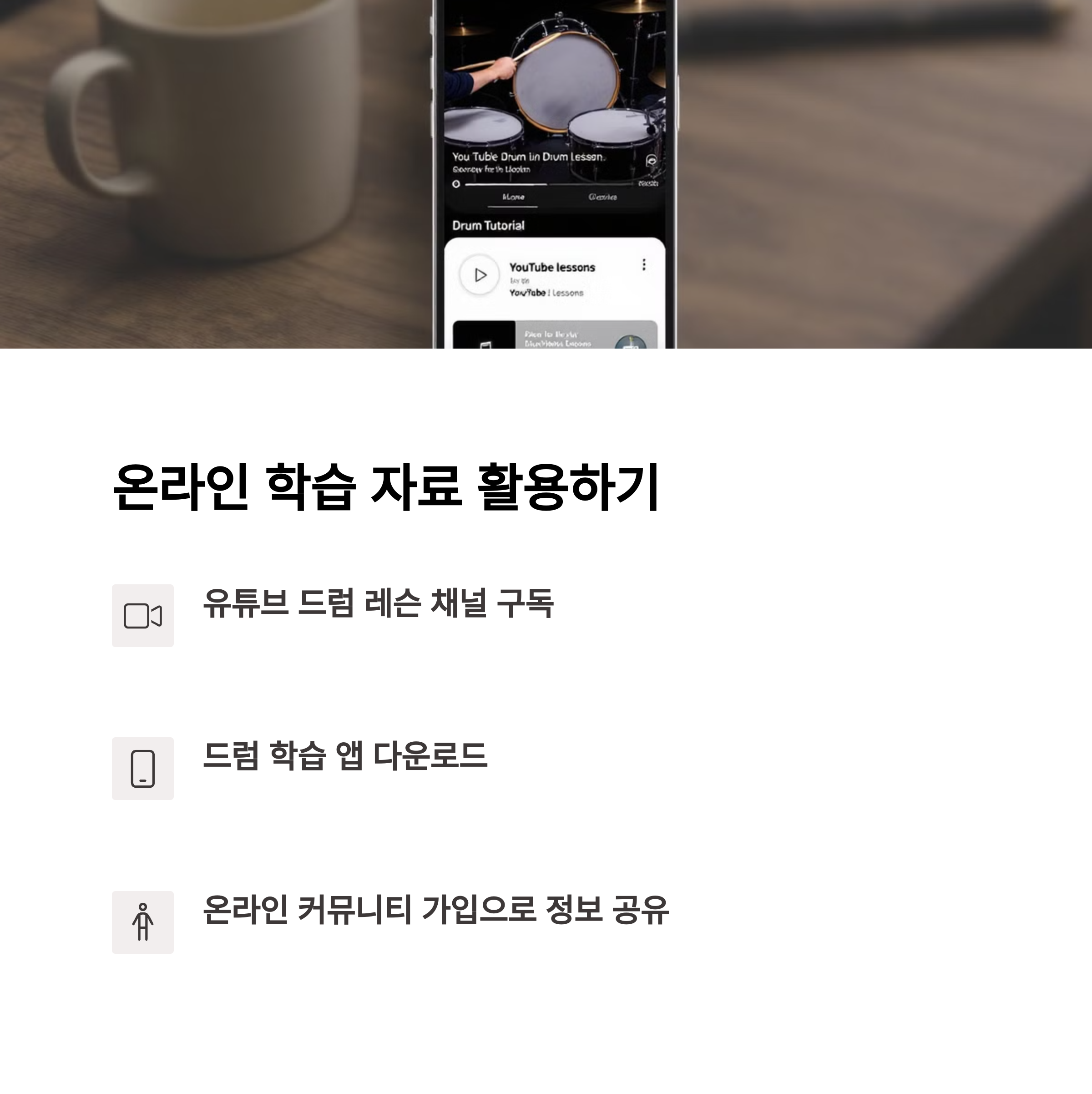| 유튜브와 앱으로 기초부터 따라하는 학습법 | 실리콘 패드, 메트로놈, 전자 드럼 등 | 영상 피드백, 온라인 커뮤니티 활용 |