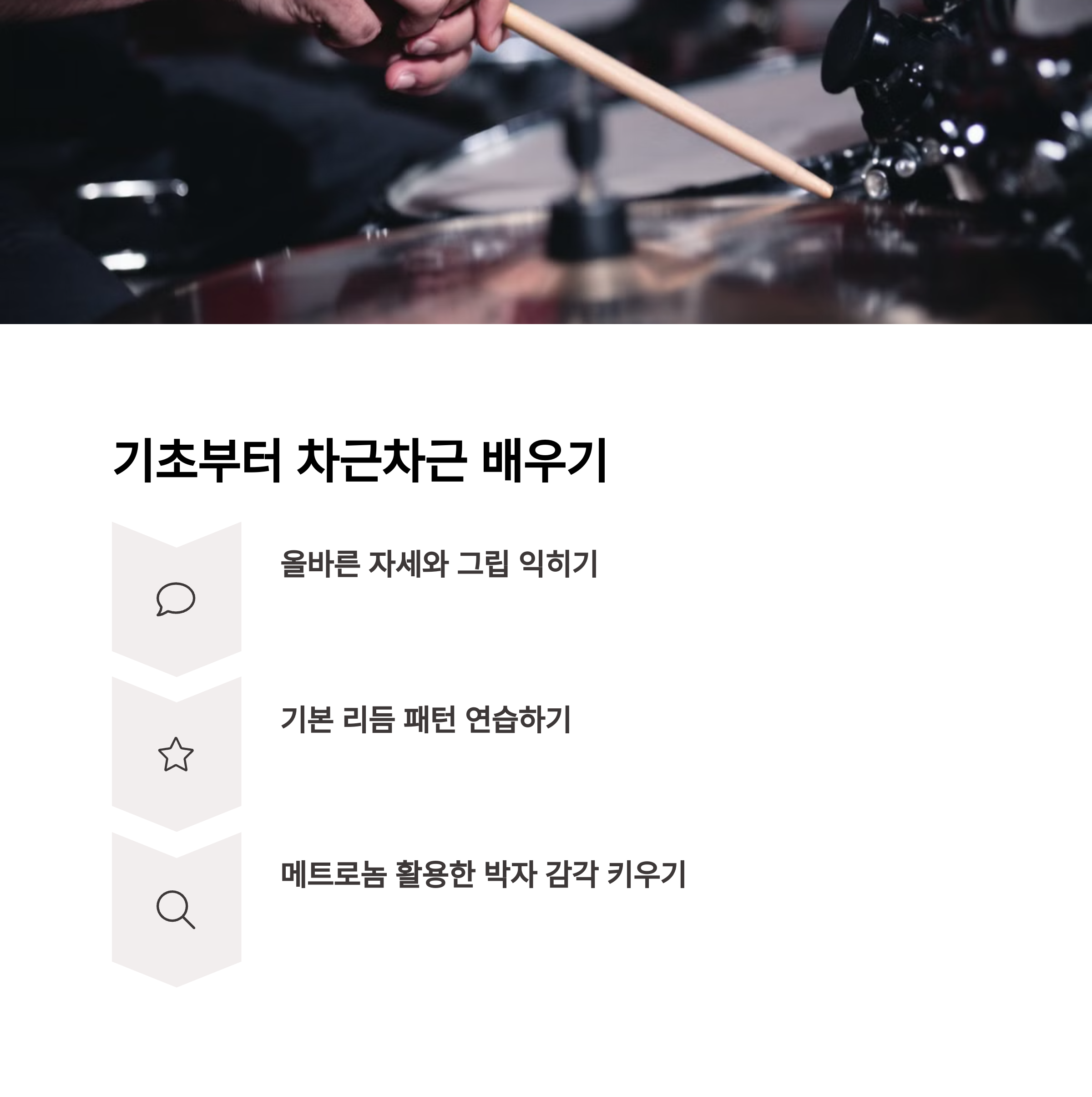 | 드럼 독학이 가능한가요? | 기본기부터 차근차근 따라하면 충분히 가능합니다. |