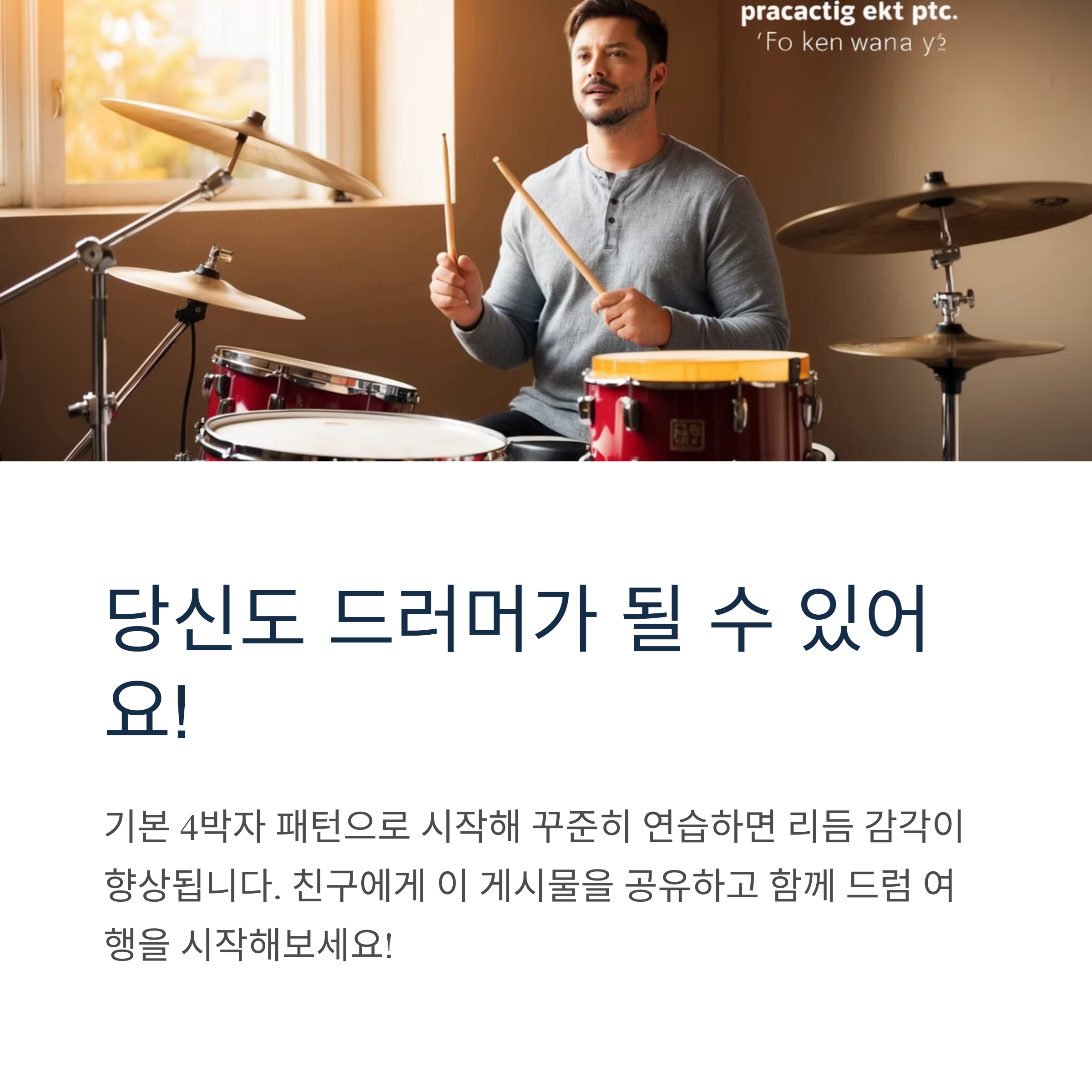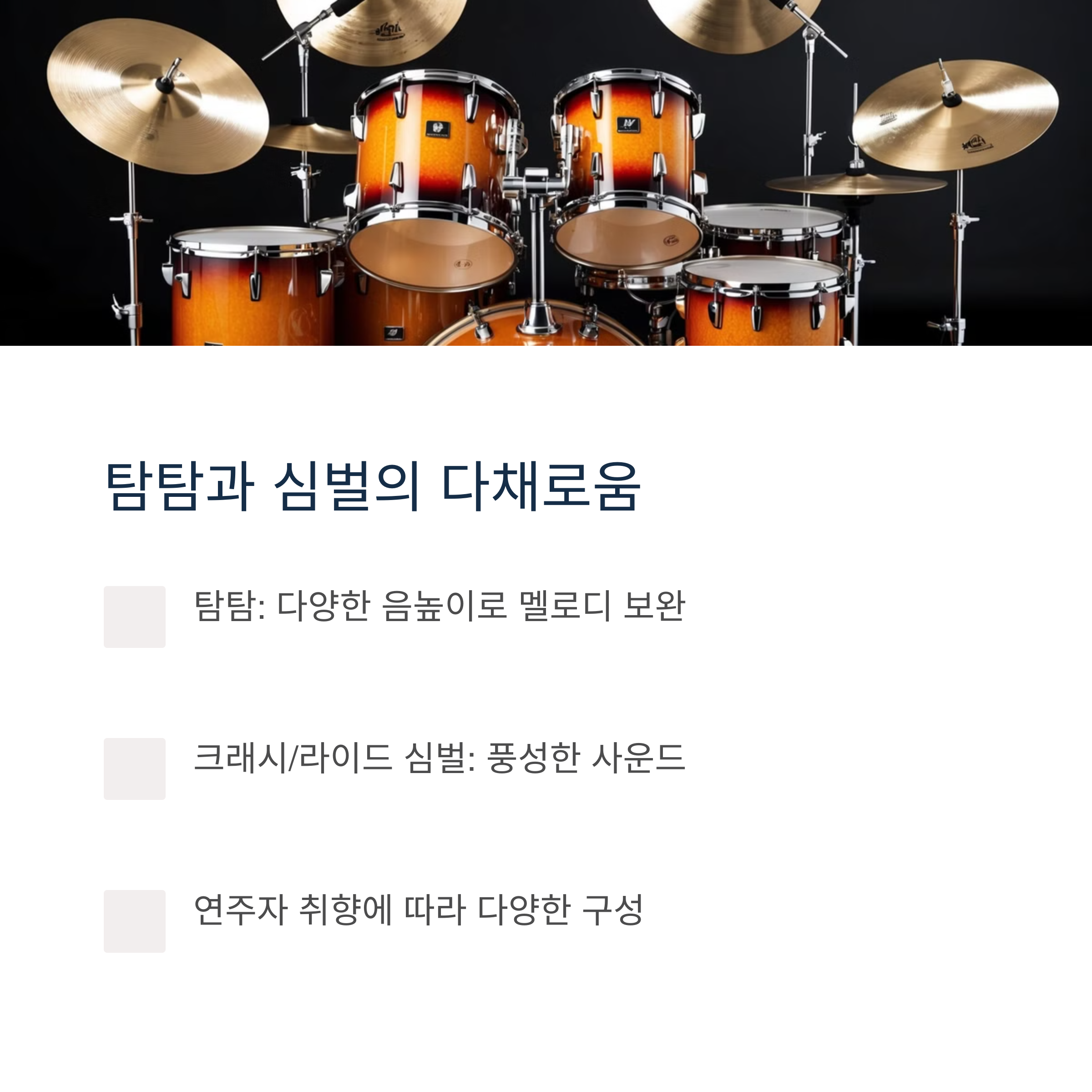 | 드럼 세트란? | 다양한 타악기로 구성된 퍼커션 악기 모음입니다. |