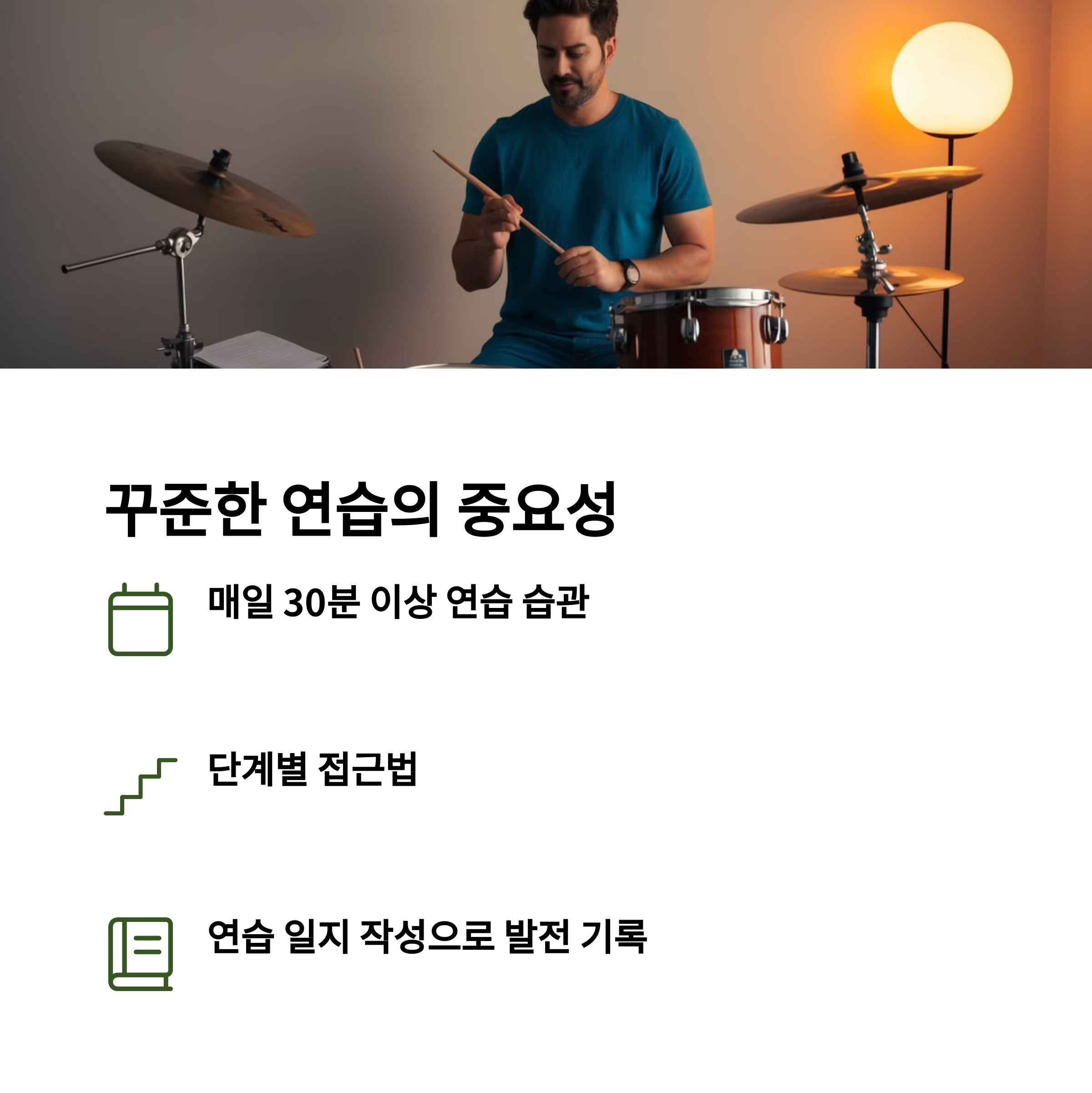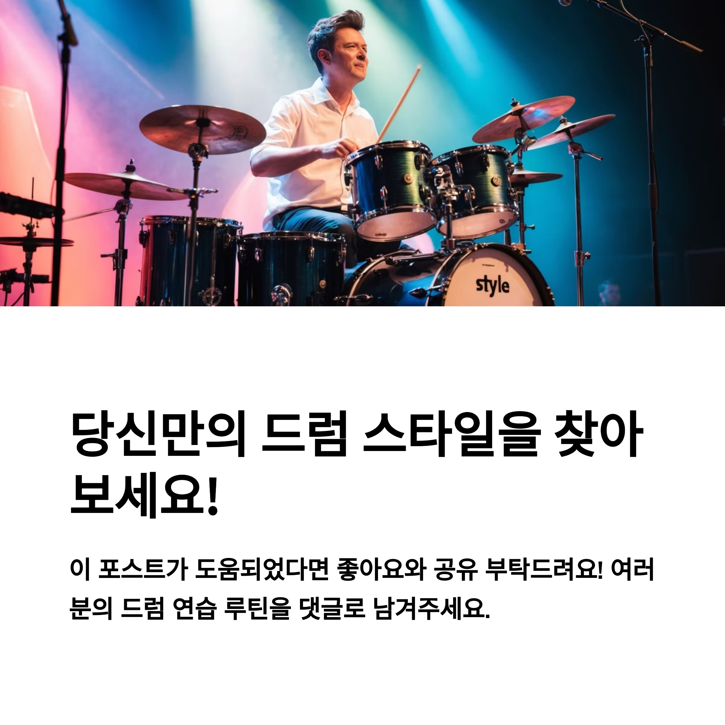 다양한 리듬을 익히는 것도 중요하지만, 반복 연습을 통해 자신만의 스타일을 만드는 과정도 반드시 필요합니다. 리듬 하나를 연습하더라도 각도, 강약, 타이밍 등을 달리하여 여러 방식으로 시도해 보세요. 메트로놈에 맞춰 꾸준히 연습하는 것도 중요하지만, 실제 음악과 함께 연습하면서 실전에 가까운 감각을 익히는 것이 더 효과적입니다. 연습이 단조롭지 않게 구성된다면, 드럼에 대한 흥미도 유지되고 실력도 자연스럽게 향상됩니다.