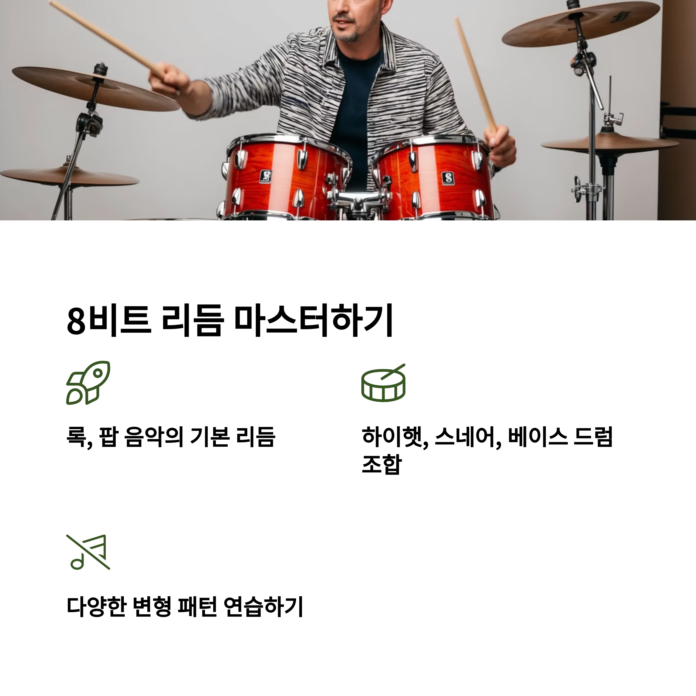 8비트, 16비트, 셔플 패턴 중심 연습 장르별 리듬 분석과 실전 적용 메트로놈 + 곡 연습 병행 추천