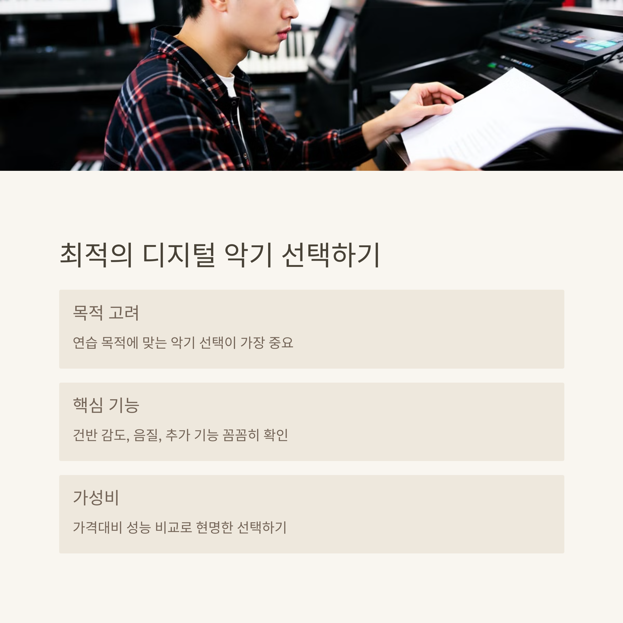 | 초보자가 연습하기 좋은 악기 | 디지털 피아노, 미디 키보드, 전자 드럼 등이 초보자에게 추천됩니다. |