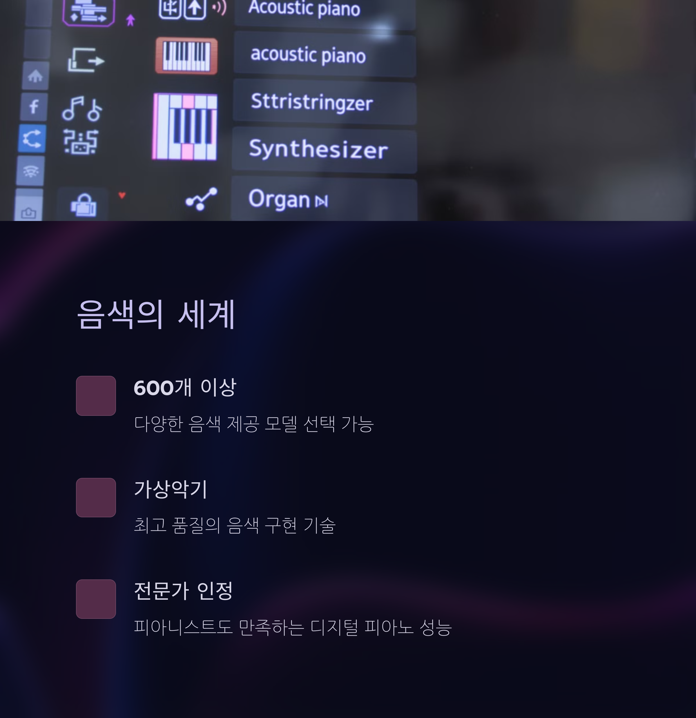 | 연습할수록 실력에 맞는 터치감 필요 | 직접 비교 청취로 원하는 분위기 찾기 | 입문자부터 전문가까지 맞춤 설정 가능 |