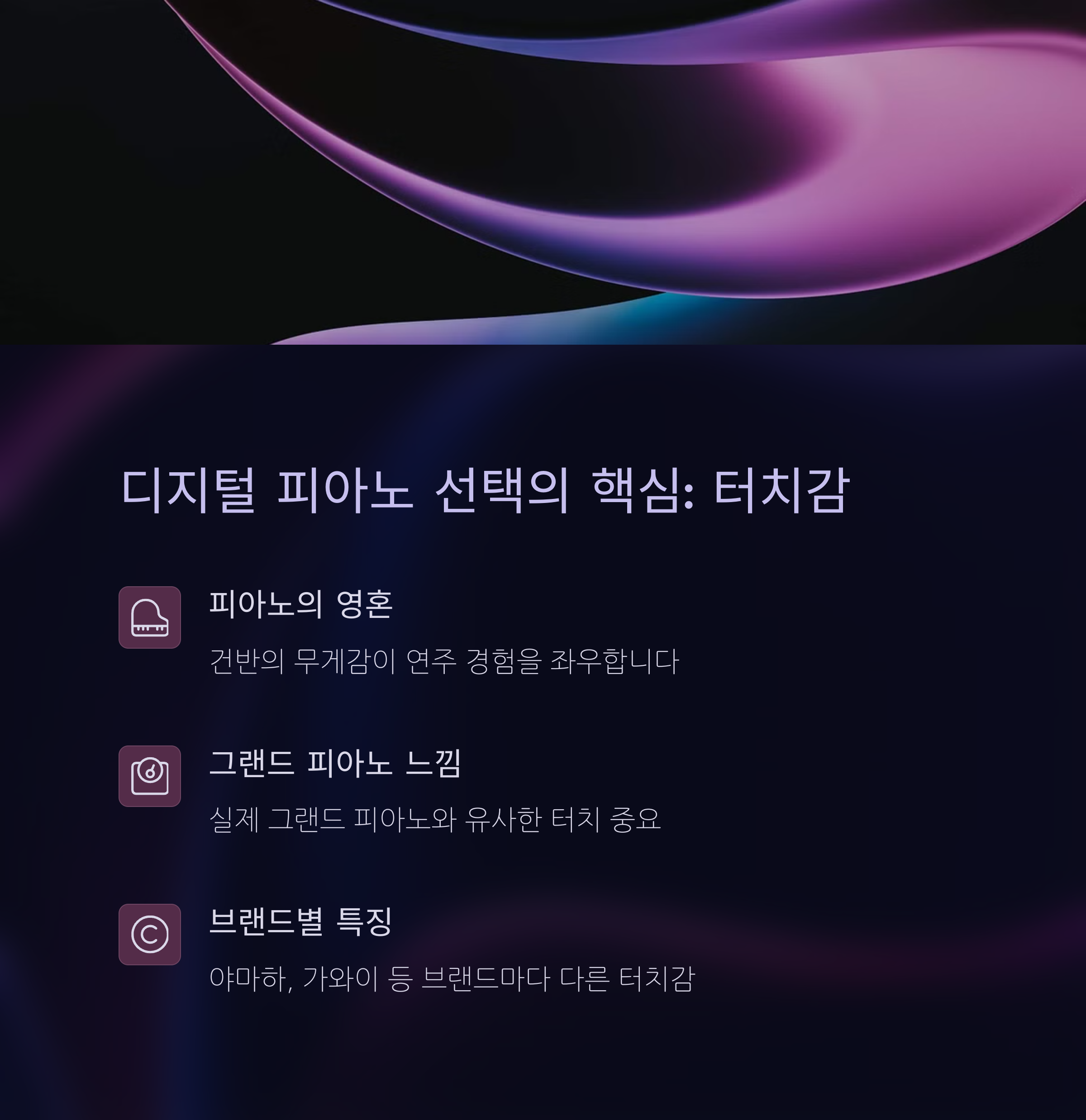| 터치감 비교 | 실제 피아노 느낌에 가까운지 꼭 확인하세요. |