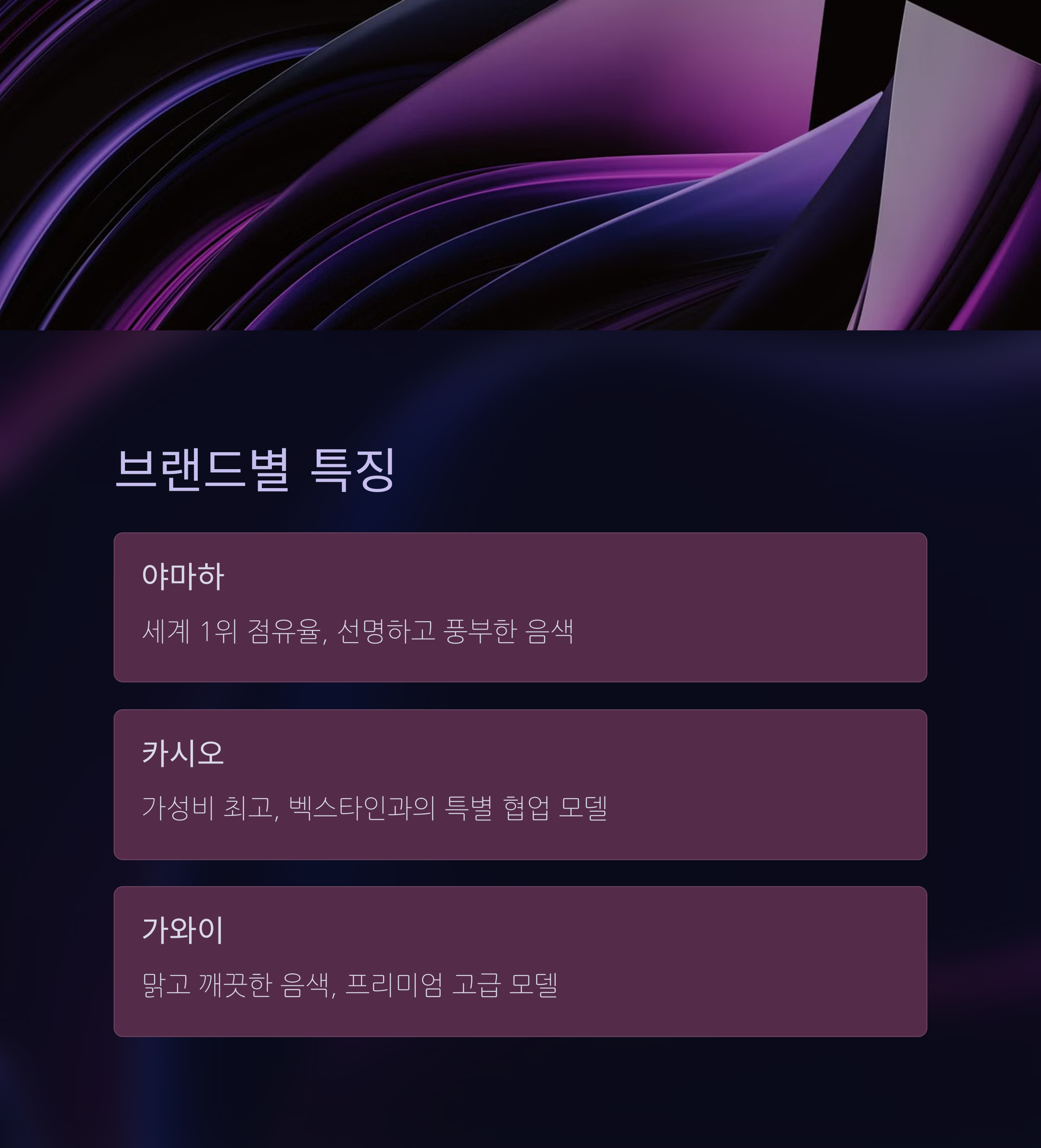 | 브랜드 특성 | 야마하, 롤랜드 등 음색 차이를 미리 들어보세요. |