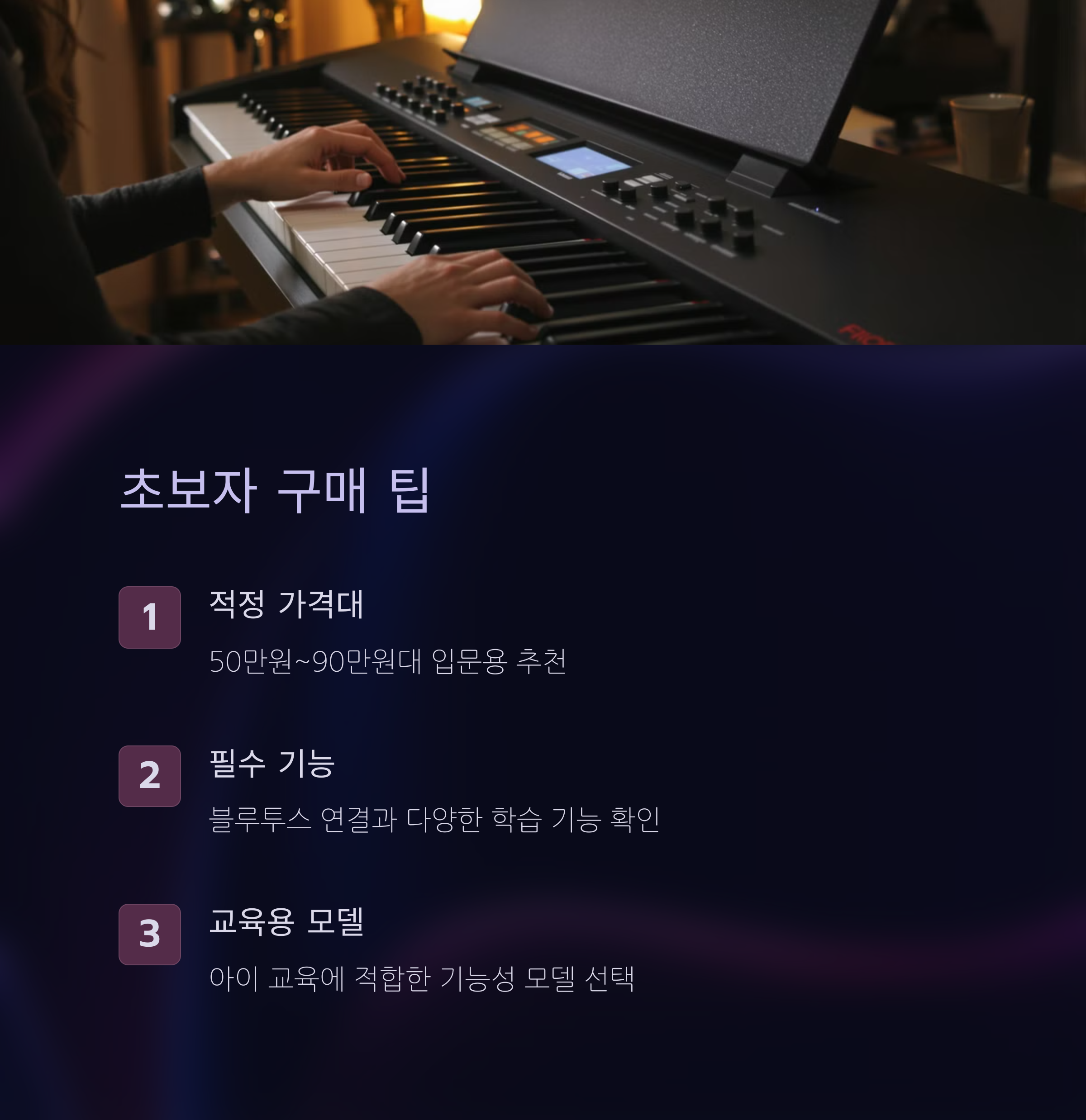 마지막으로 중요한 건 디지털 피아노의 부가기능과 연결성입니다. 최근 제품들은 블루투스, USB-MIDI, 녹음 기능까지 다양하게 탑재되어 있어 단순한 연주용을 넘어 작곡, 수업, 콘텐츠 제작까지 활용할 수 있습니다. 특히 스마트폰 앱과의 연동 기능은 초보자에게 유용하며, 다양한 연습 모드를 통해 보다 효과적인 학습이 가능합니다. 자신이 어떤 목적으로 디지털 피아노를 사용할지 미리 설정해본다면 훨씬 더 만족스러운 구매가 될 것입니다.