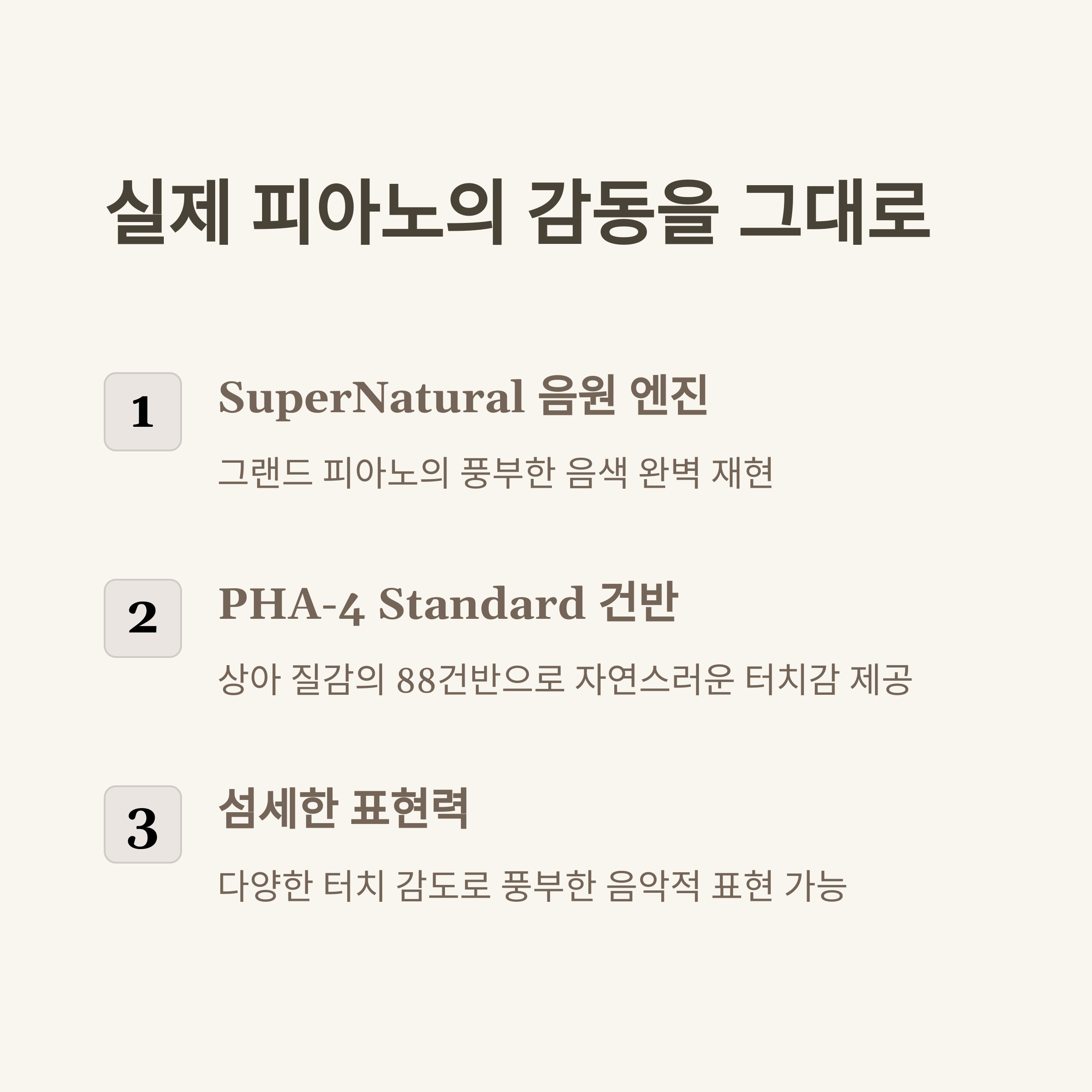 - 건반: PHA-4 Standard 건반 (이스케이프먼트 기능 및 아이보리 필 적용)