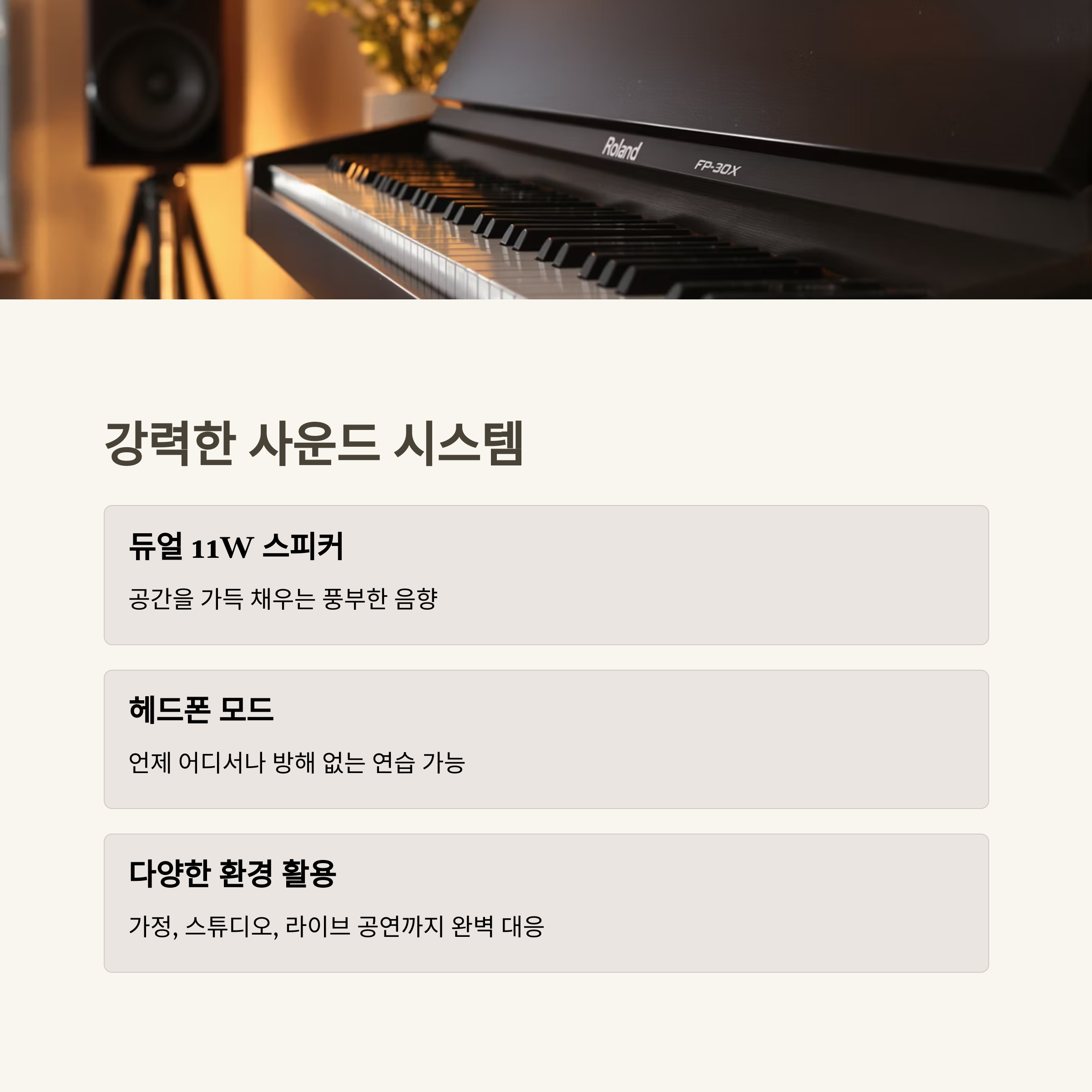 롤랜드 FP-30X는 컴팩트한 디자인과 뛰어난 성능으로 많은 사용자들에게 사랑받는 디지털 피아노입니다. 이 제품은 롤랜드의 독자적인 SuperNatural 피아노 음원과 PHA-4 Standard 건반을 탑재하여 실제 그랜드 피아노와 유사한 터치감과 음질을 제공합니다. 특히, 가정에서 연습용으로 사용하기 좋으며, 이동이 간편해 작은 무대나 스튜디오에서도 활용할 수 있습니다.
