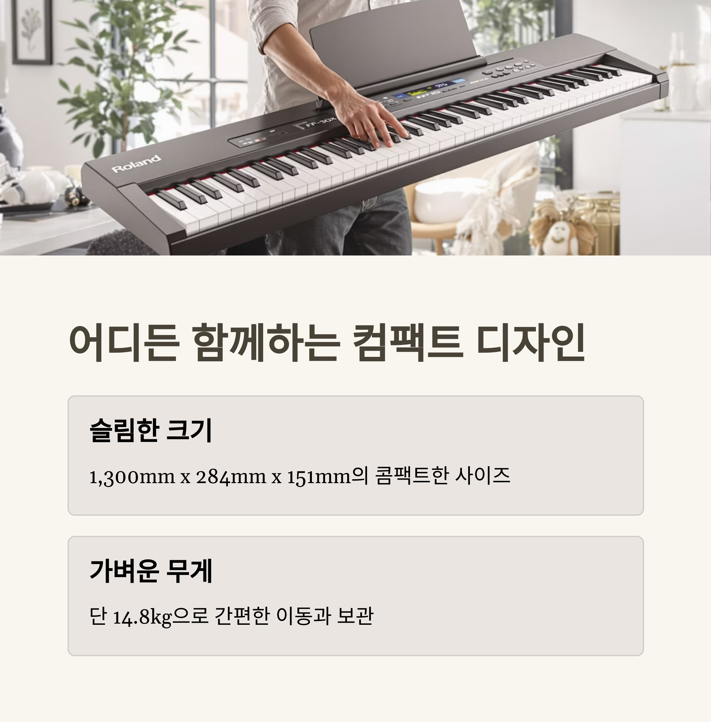 롤랜드 FP-30X는 슬림한 디자인으로 공간 활용도가 뛰어납니다. 제품의 크기와 무게는 다음과 같습니다: