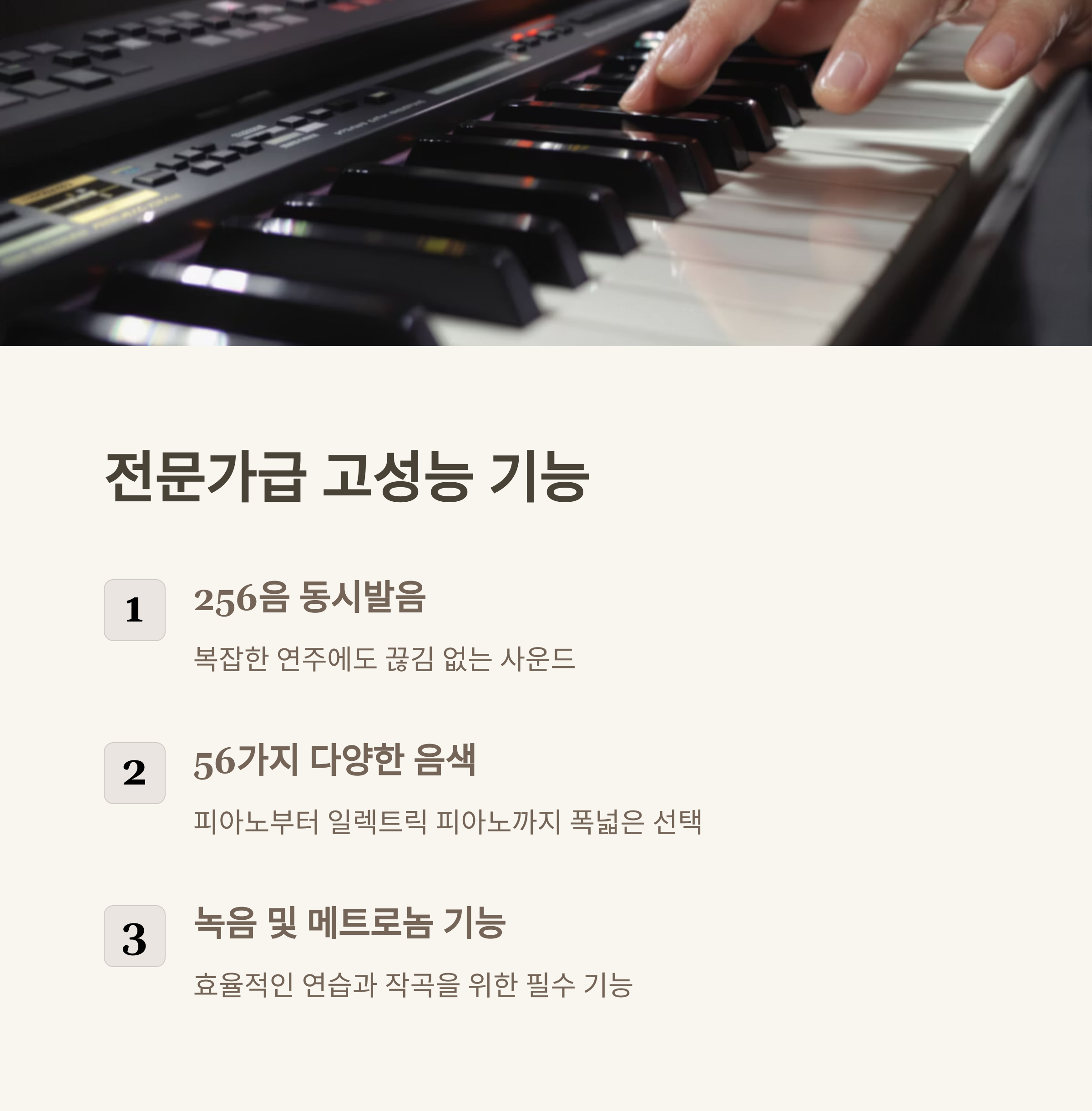 - 편의 기능: 메트로놈, 듀얼 스플릿, 트윈 피아노 모드 등