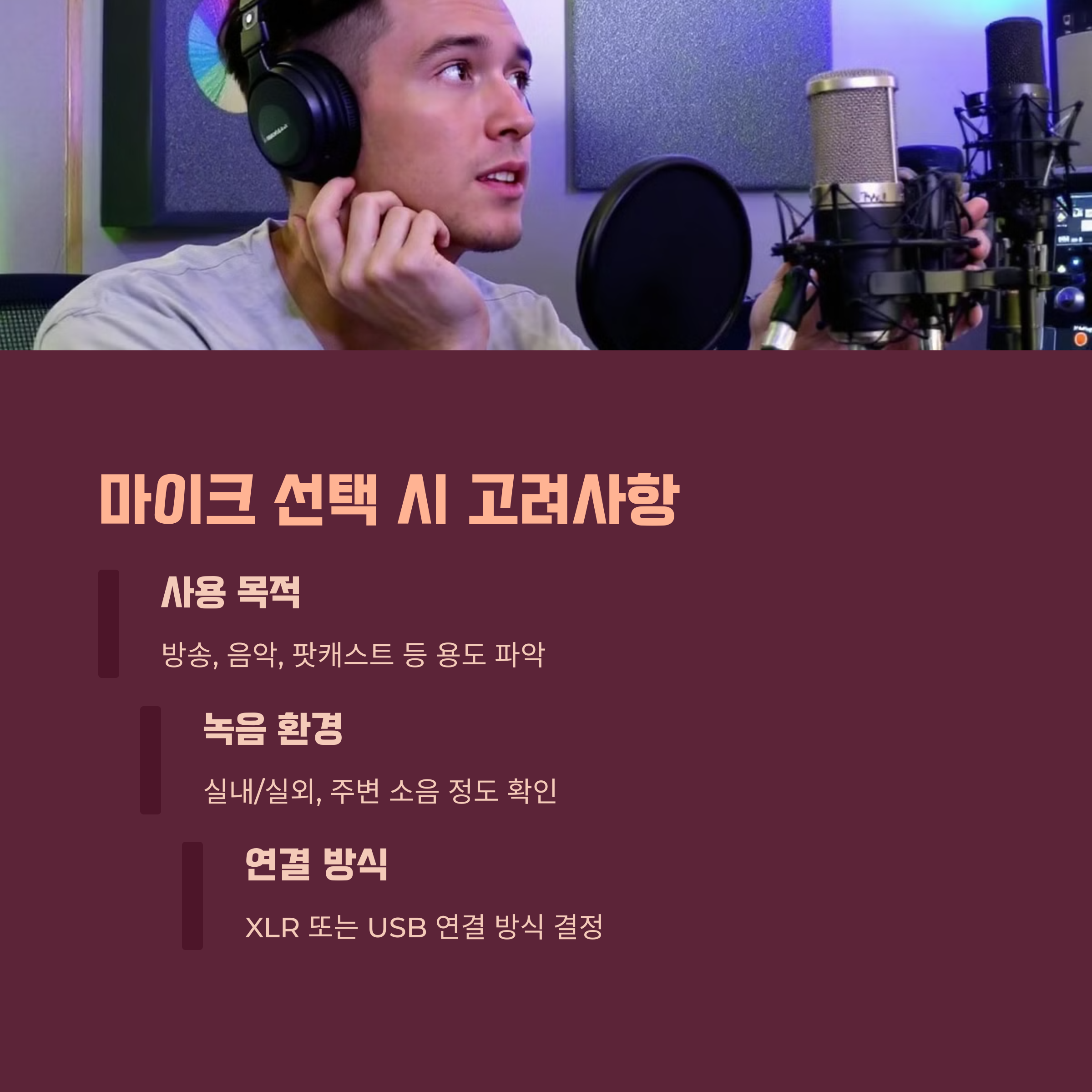 민감도 높고 음질 우수, 정밀한 녹음에 적합 내구성 강하고 노이즈에 강함, 실전용에 적합 감도, 주파수 응답, 용도, 연결 방식 고려