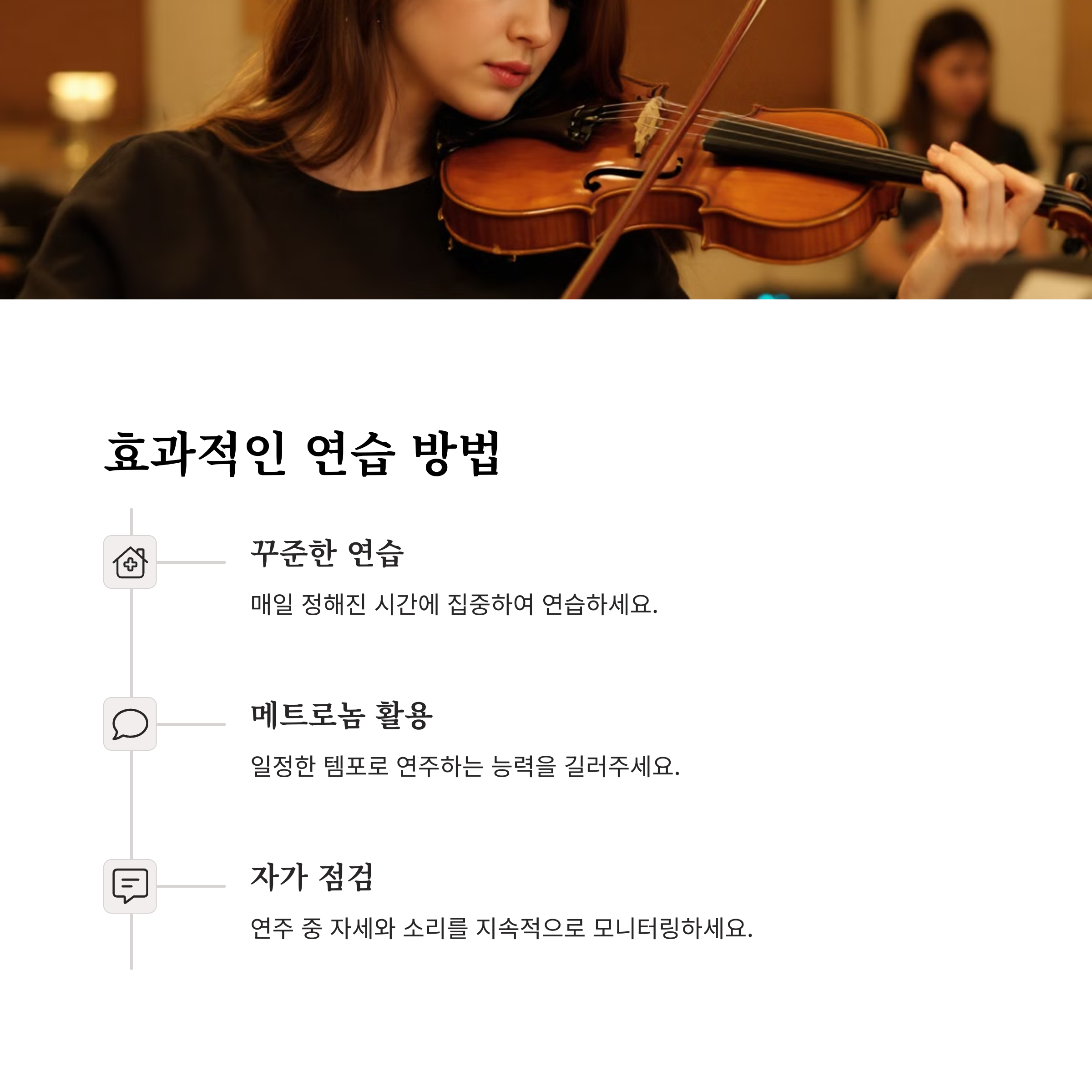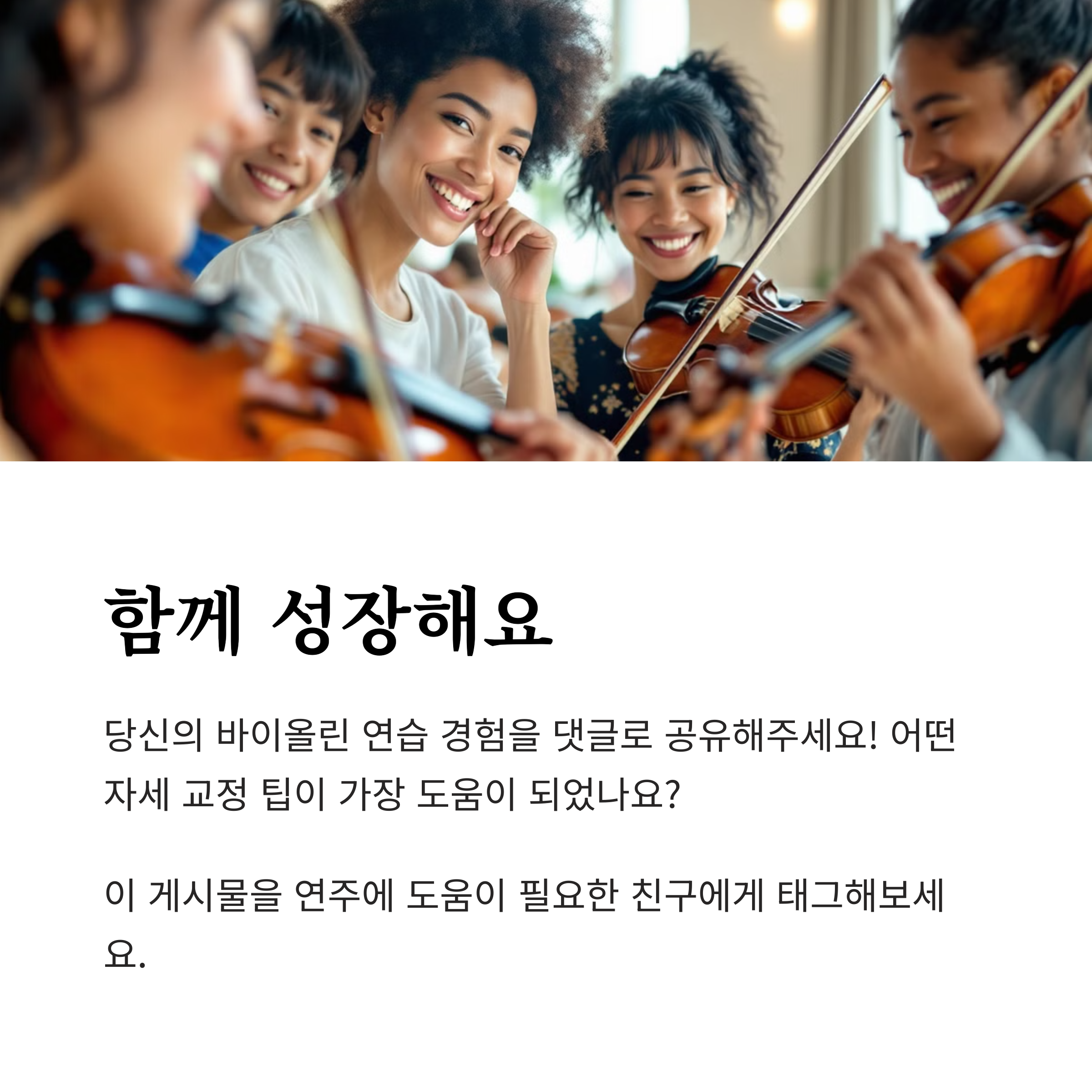 바이올린 연습을 하면서 어려움을 겪은 경험이 있나요? 혹은 도움이 되었던 연습법이 있다면 댓글로 공유해주세요! 함께 이야기하며 더 나은 연주를 만들어가요.
