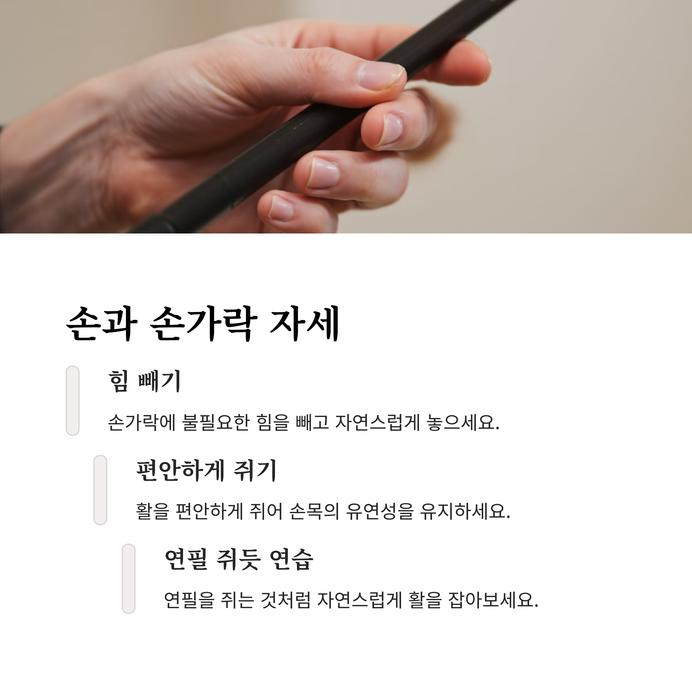| 손의 위치 | 자연스럽고 편안하게 활을 쥐어야 합니다. |