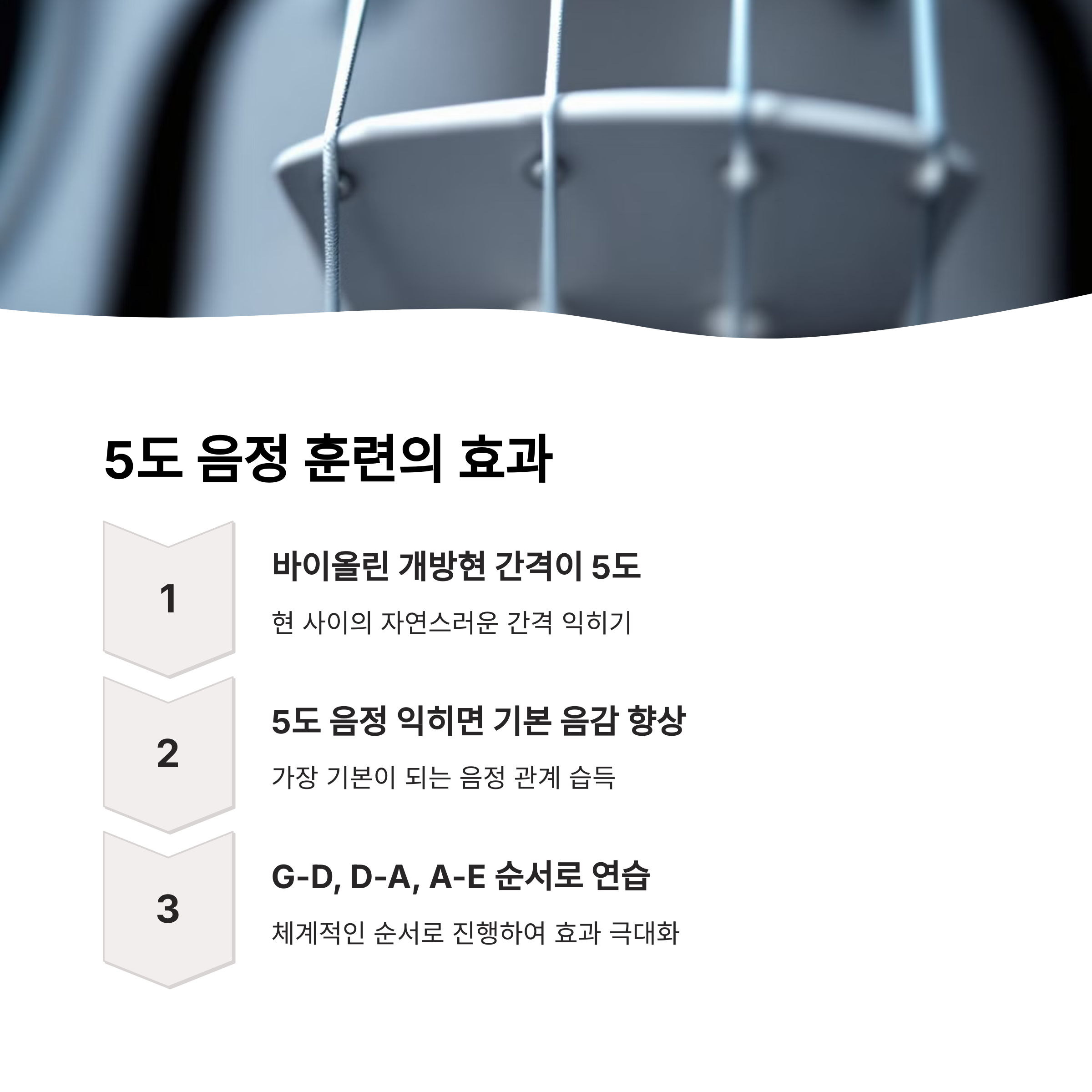 정확한 음을 체크하고 보정할 수 있는 필수 도구 개방현 기준의 5도 음정으로 손가락 교정 가능 귀로 음정 차이를 인지하는 훈련의 중요성
