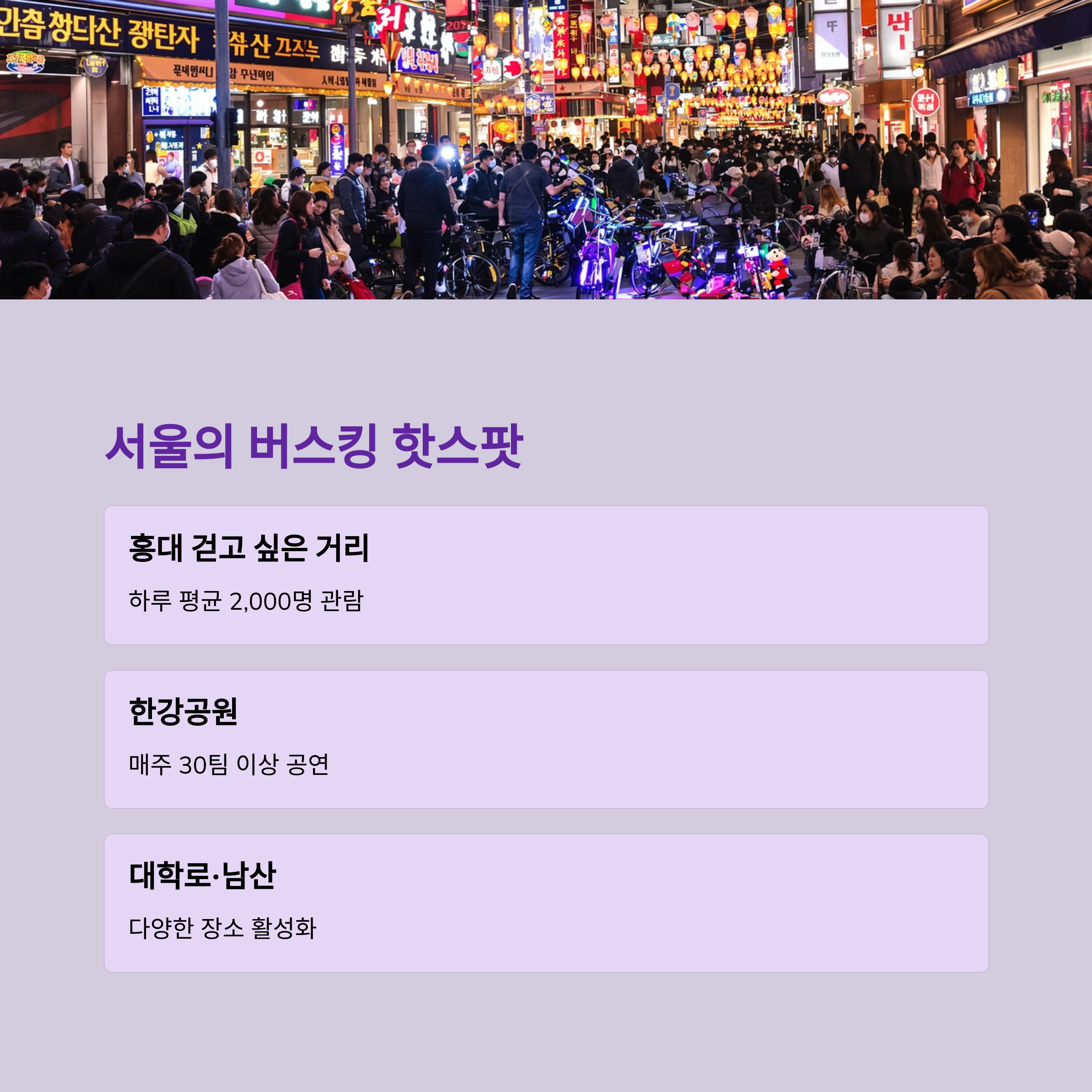 - 국내: 서울 대학로, 홍대, 한강공원(특히 반포, 뚝섬, 망원, 여의도 등 22곳 공식 버스킹존), 전주 한옥마을 등