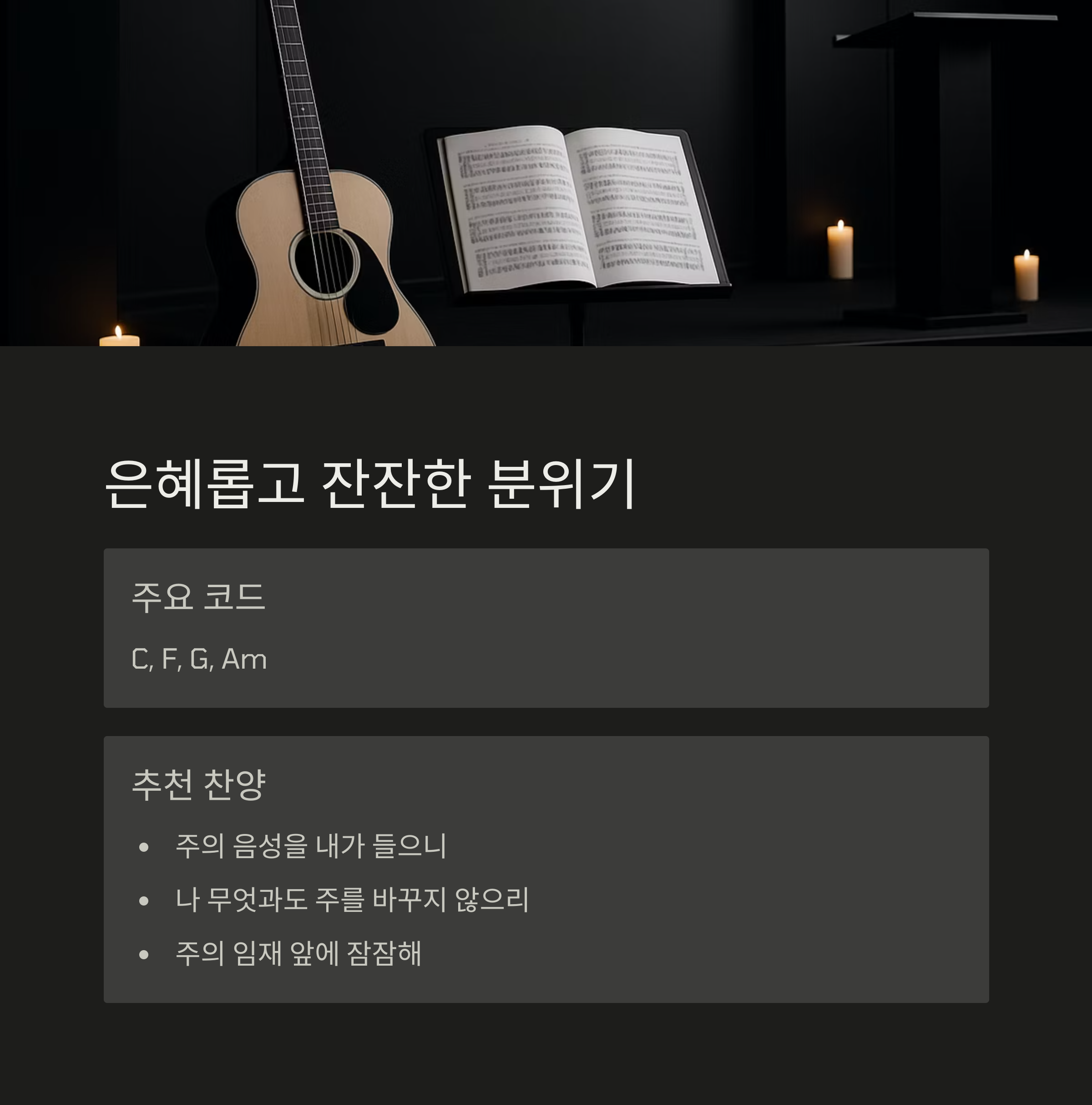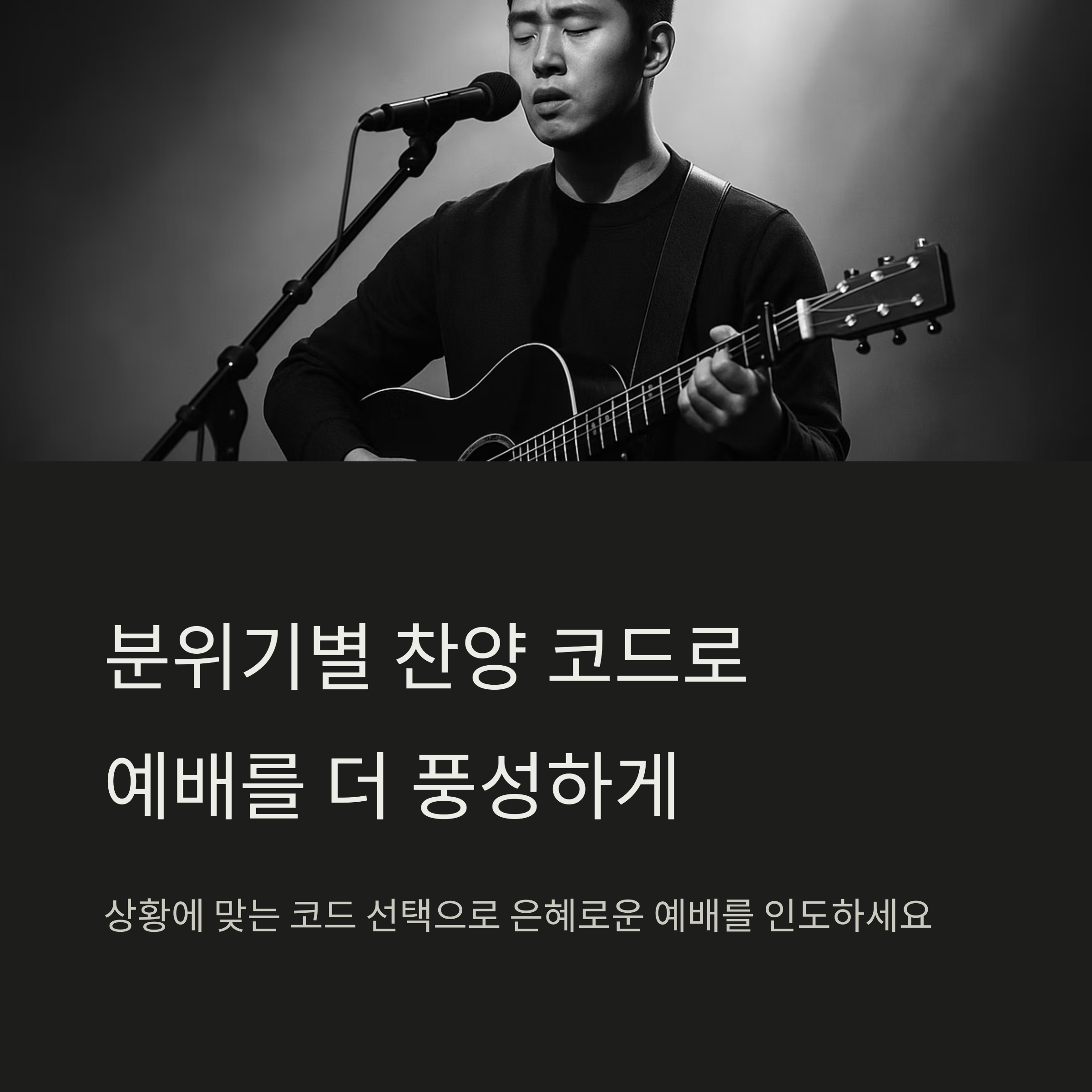 분위기별 찬양 코드 추천은 예배의 흐름을 자연스럽게 연결하고 감정선을 고조시키는 데 중요합니다. 각 상황에 맞는 코드와 곡으로 예배자들의 마음을 하나님께 집중시켜보세요.