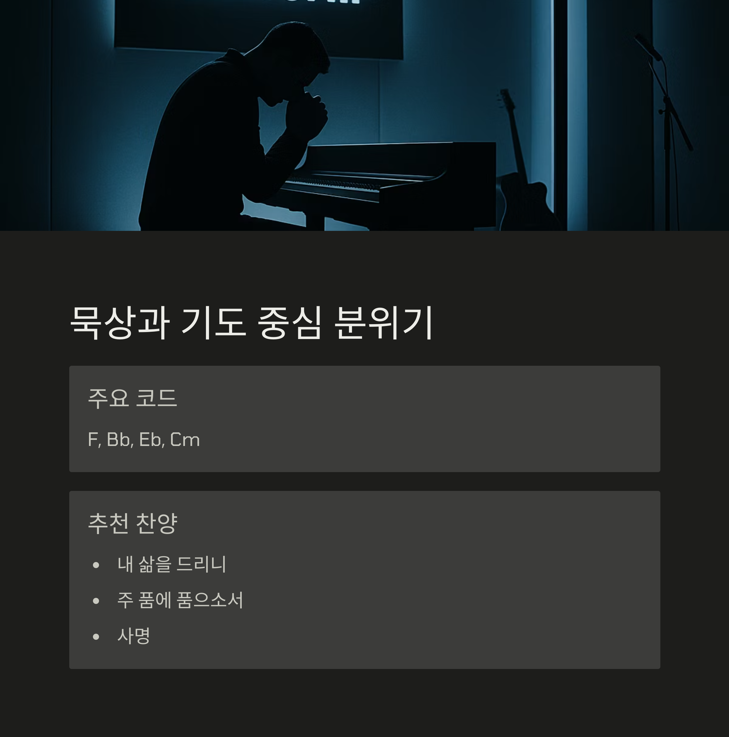 | 여성 보컬용 찬양 코드 추천 – 부드럽고 안정적인 음역의 코드 선택 가이드 (0) | 2025.06.11 |