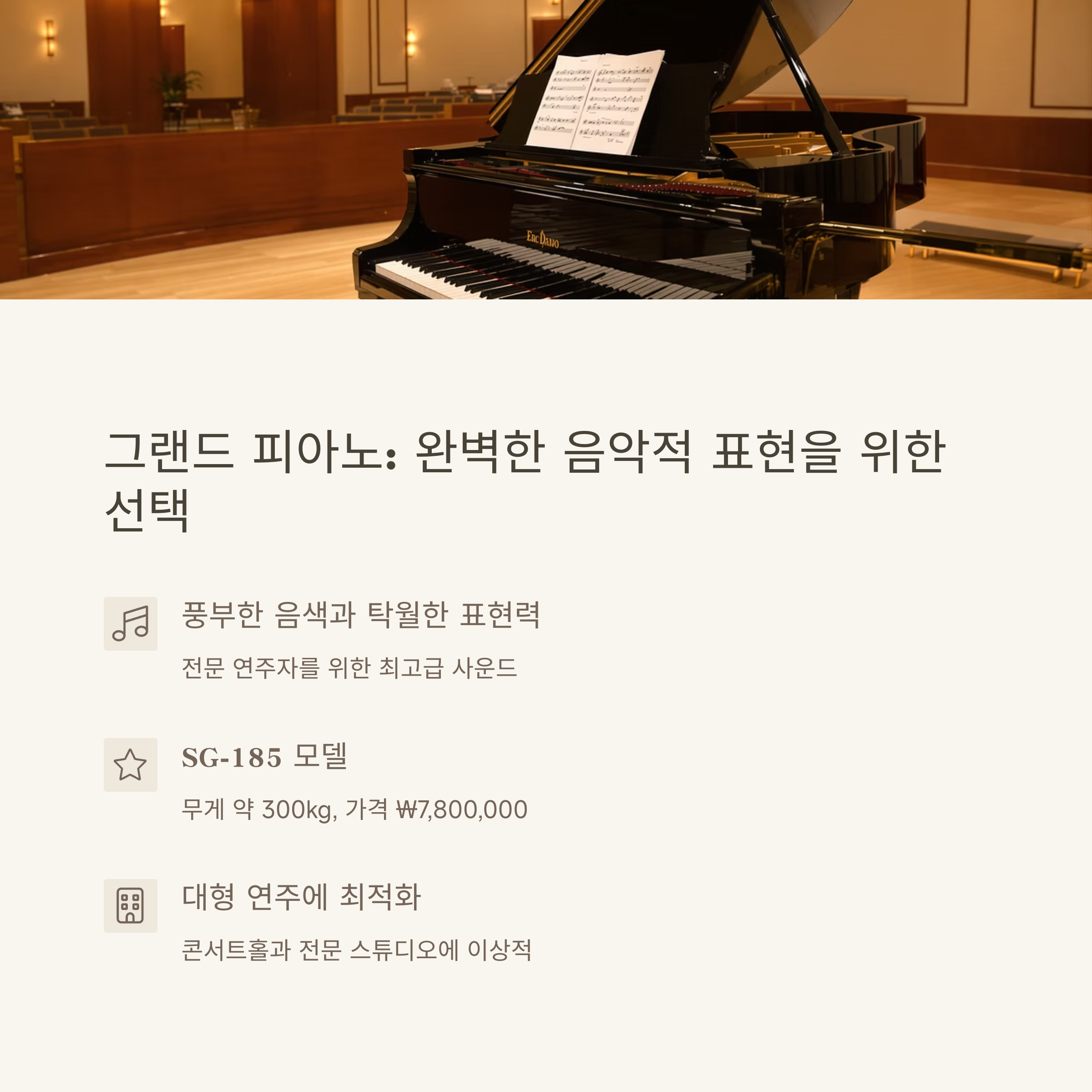 그랜드 피아노는 넓은 음역과 풍부한 음색으로 전문 연주자들에게 사랑받는 모델입니다.