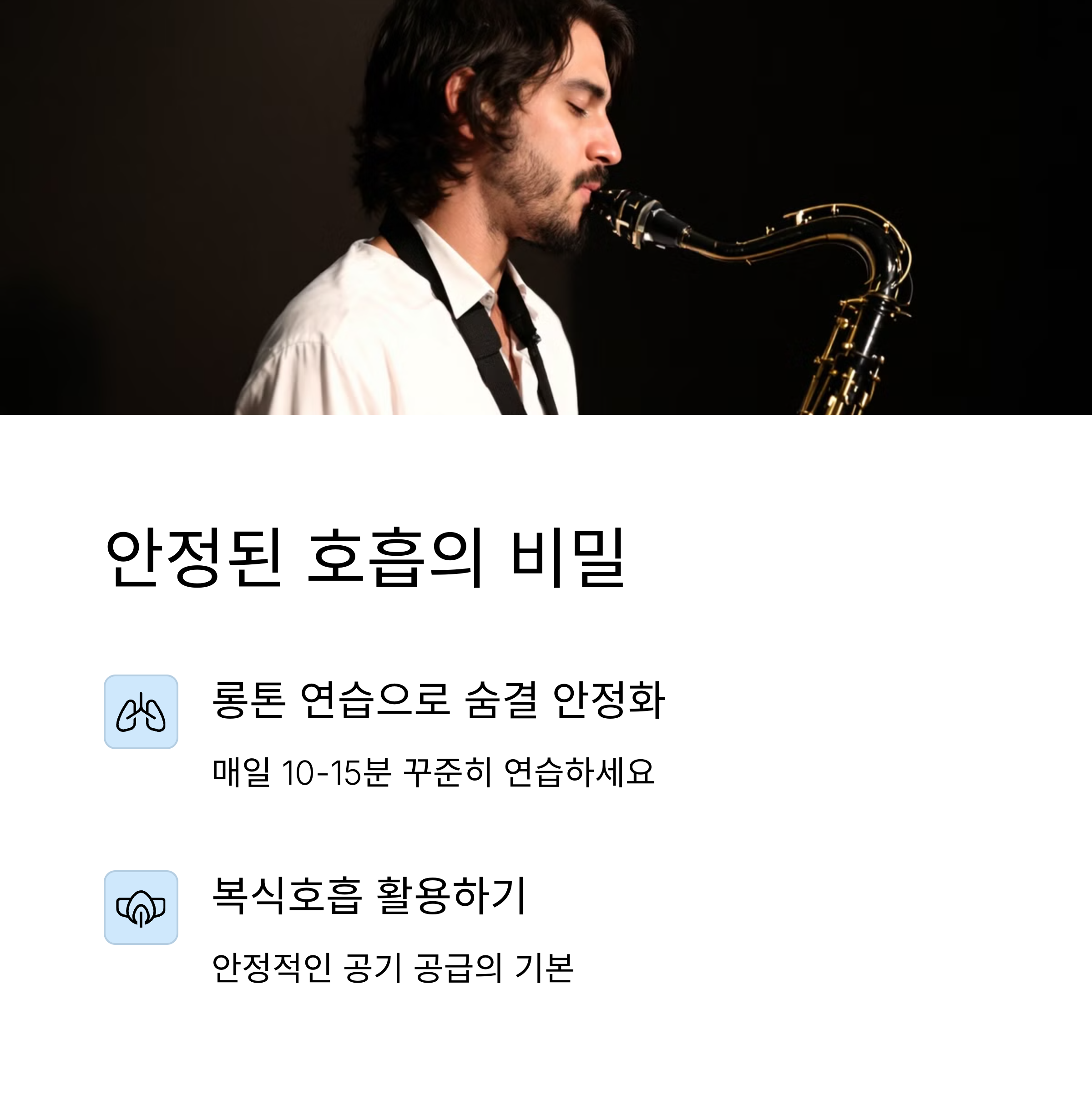 색소폰 연주를 부드럽게 하기 위한 첫걸음은 바로 호흡의 안정성입니다. 많은 연주자들이 숨을 충분히 들이마시지 않거나, 내쉴 때 급하게 공기를 밀어내는 경향이 있습니다. 하지만 부드러운 소리를 위해선 지속적이고 일정한 공기 흐름이 매우 중요합니다. 단순한 호흡 훈련이라도 꾸준히 반복한다면, 연주 시 공기 압력을 일정하게 유지할 수 있어 소리가 훨씬 따뜻하고 유연하게 들리게 됩니다. 특히 롱톤 훈련을 통해 공기의 속도와 방향을 제어하는 능력을 기르는 것이 중요합니다. 이러한 기초적인 훈련이야말로 부드러운 연주의 핵심이라고 할 수 있습니다.