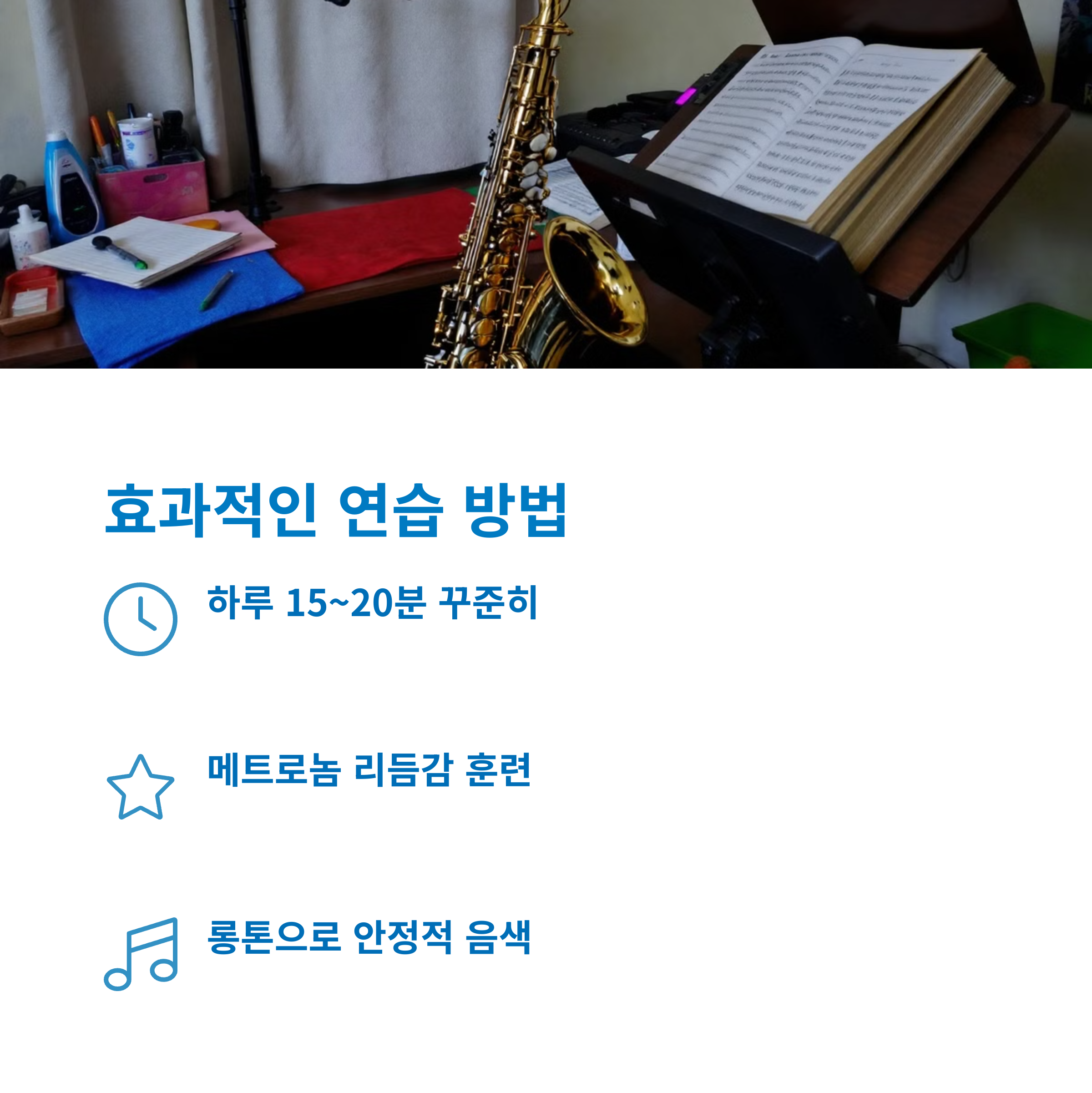 연습 방법은 입문자에게 가장 큰 고민 중 하나입니다. 매일 15~20분씩 꾸준히 연습하는 것이 중요하며, 처음에는 음을 정확히 내는 데 집중해야 합니다. 리드의 관리와 앰부셔(입 모양) 유지법을 익히는 것도 좋은 음색을 위한 핵심 요소입니다. 또한 메트로놈을 활용하여 리듬감을 기르는 것도 꼭 필요합니다. 유튜브에는 다양한 강의 영상이 있으므로 독학하시는 분들도 충분히 참고하실 수 있습니다.