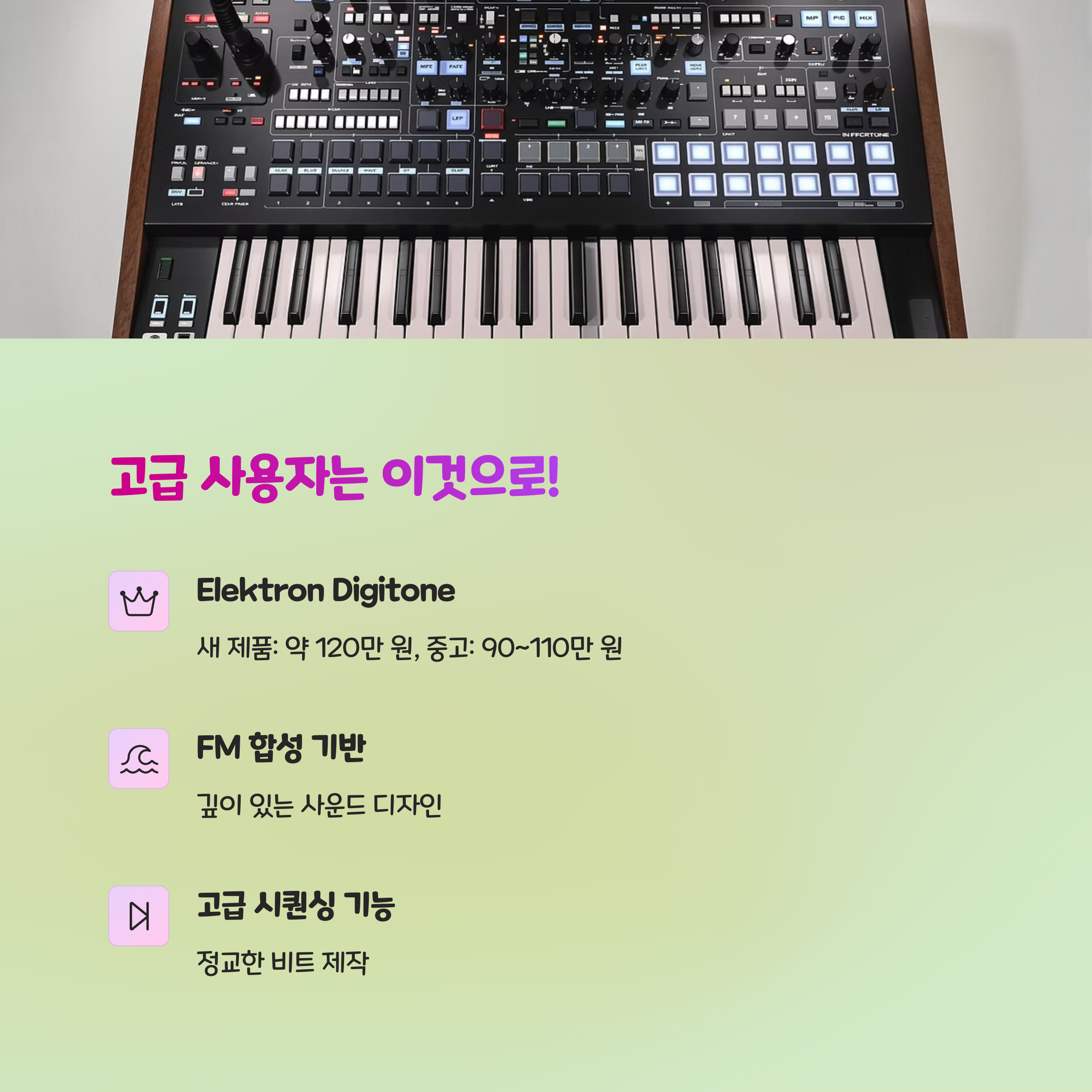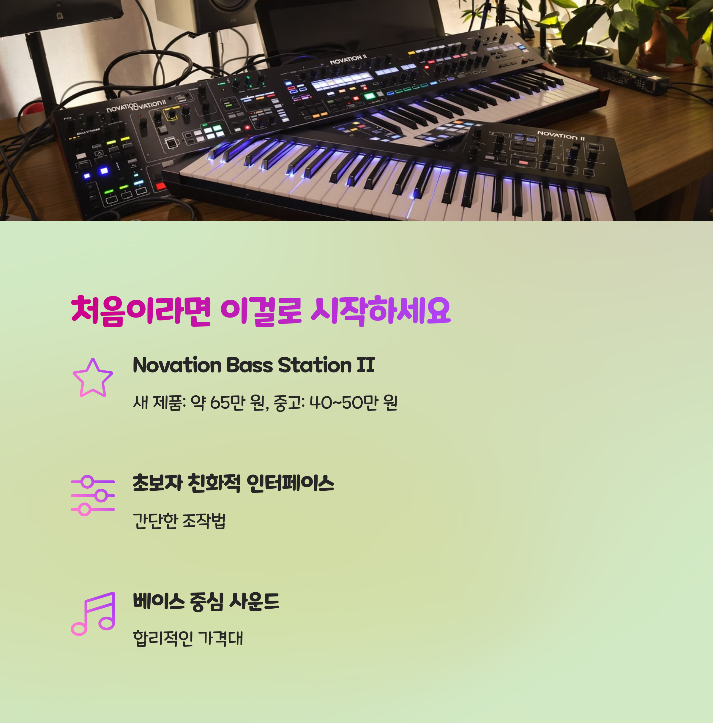 초보자에게 적합한 신디사이저는 직관적인 인터페이스와 다양한 사운드 옵션을 제공하는 모델이어야 합니다. 위에서 소개한 Korg Minilogue XD와 Arturia MiniFreak 모두 초보자에게 추천할 만한 제품입니다. 이 외에도 다음과 같은 모델들이 있습니다: