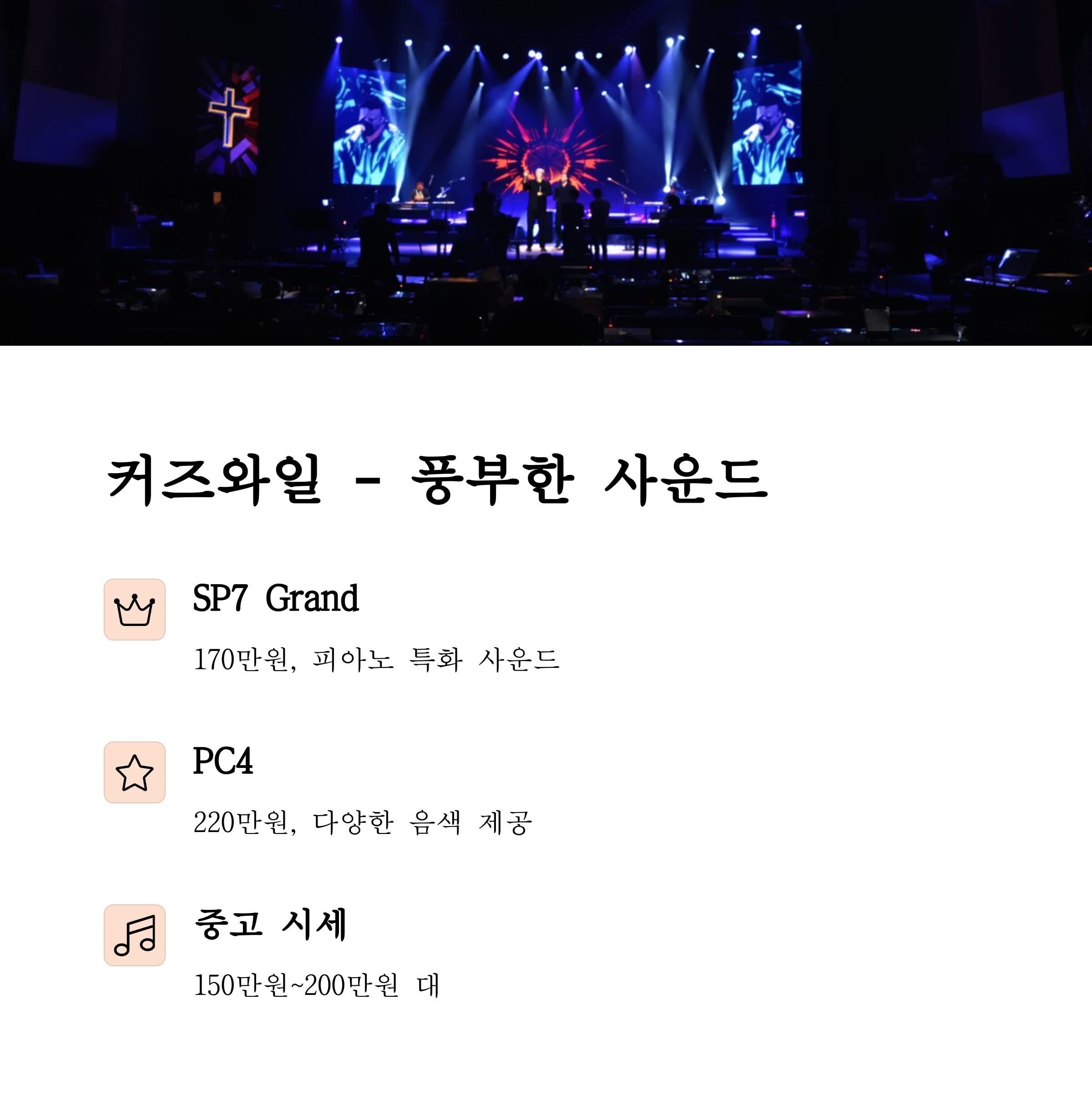 커즈와일은 고급스러운 음색과 안정적인 성능으로 교회 반주 및 스튜디오 작업에 적합한 제품들을 선보이고 있습니다.