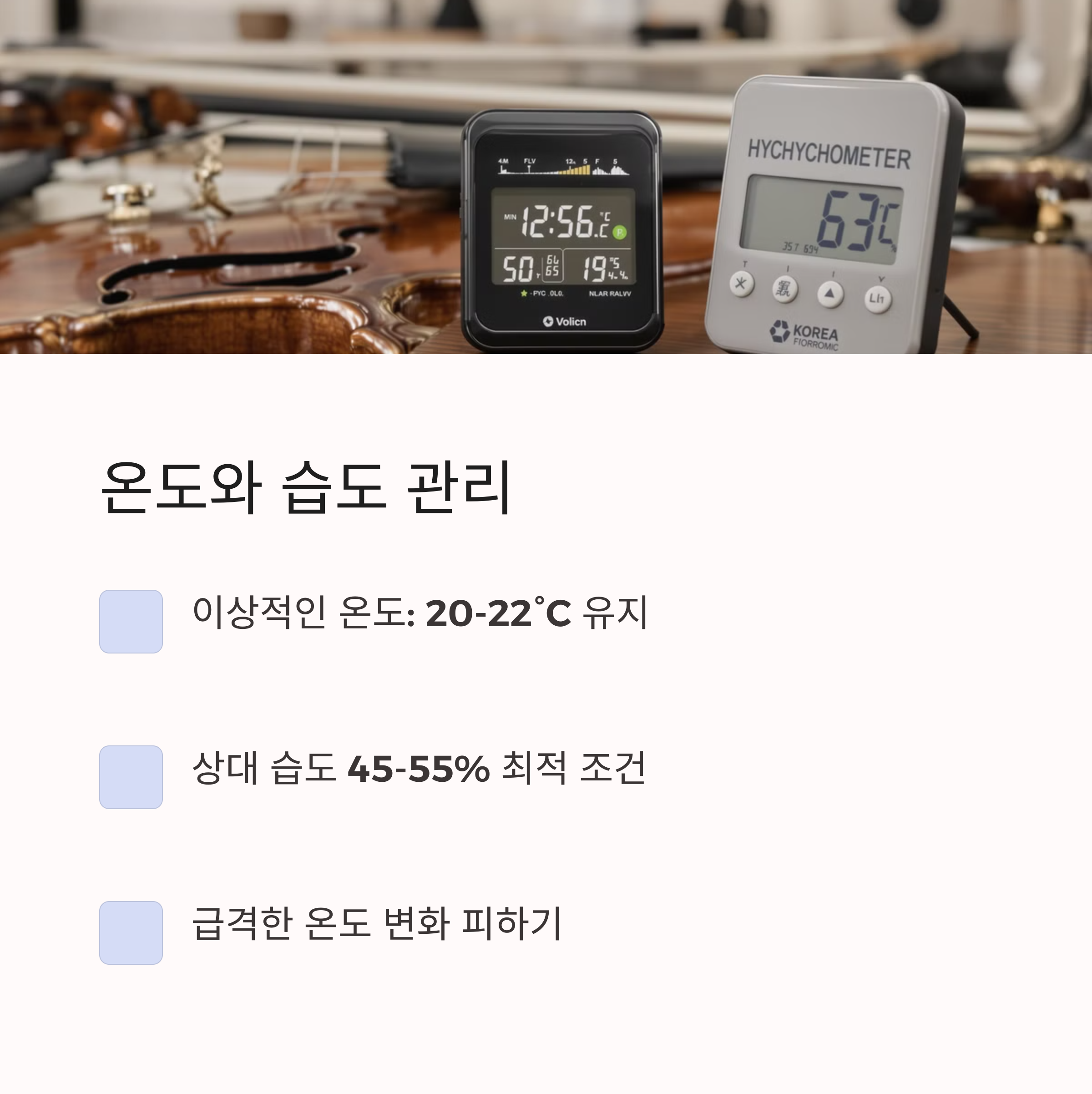 악기 보관 방법 중 가장 많이 실수하는 부분이 바로 습도 조절입니다. 특히 장마철이나 겨울철 난방으로 실내가 건조해지면, 나무 악기는 쉽게 수축하거나 갈라질 수 있습니다. 이럴 때는 가습기나 실내 습도계를 활용하여 습도를 조절해주는 것이 좋습니다. 반대로 너무 높은 습도도 악기에 좋지 않기 때문에, 제습기나 실리카겔을 함께 사용하는 것도 추천드립니다. 악기를 매일 사용하는 분이라면 하루 1회 통풍을 해주는 것도 중요합니다.