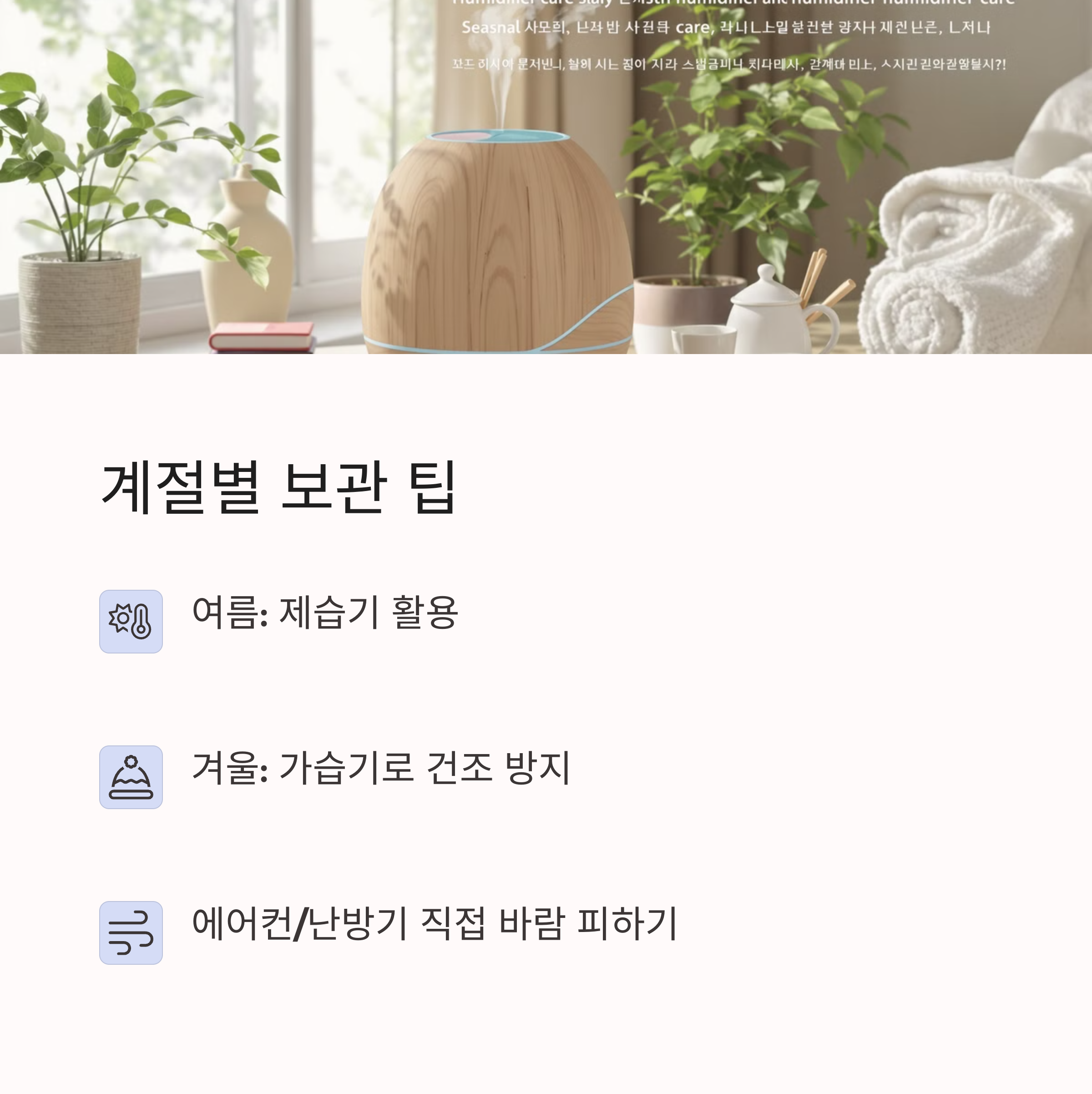 | 계절별 온도 변화 주의 | 가습기, 제습기 적절히 사용 | 전용 천이나 솔로 관리 필수 |