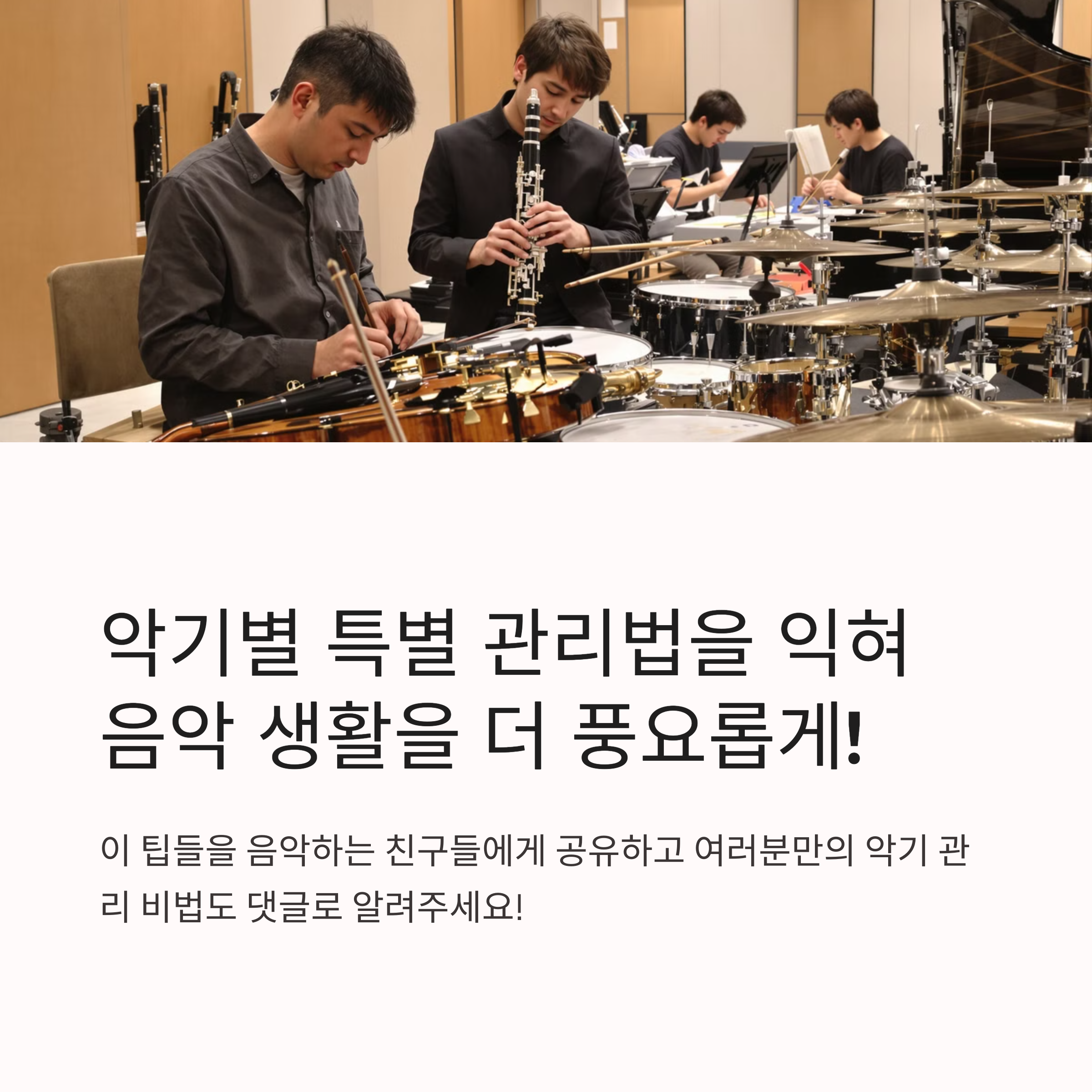 여러분은 평소에 어떤 악기 보관 방법을 사용하고 계신가요? 혹은 보관 중에 생겼던 에피소드나 꿀팁이 있다면 함께 공유해주세요. 댓글로 남겨주시면 다른 음악인들에게도 큰 도움이 될 거예요!