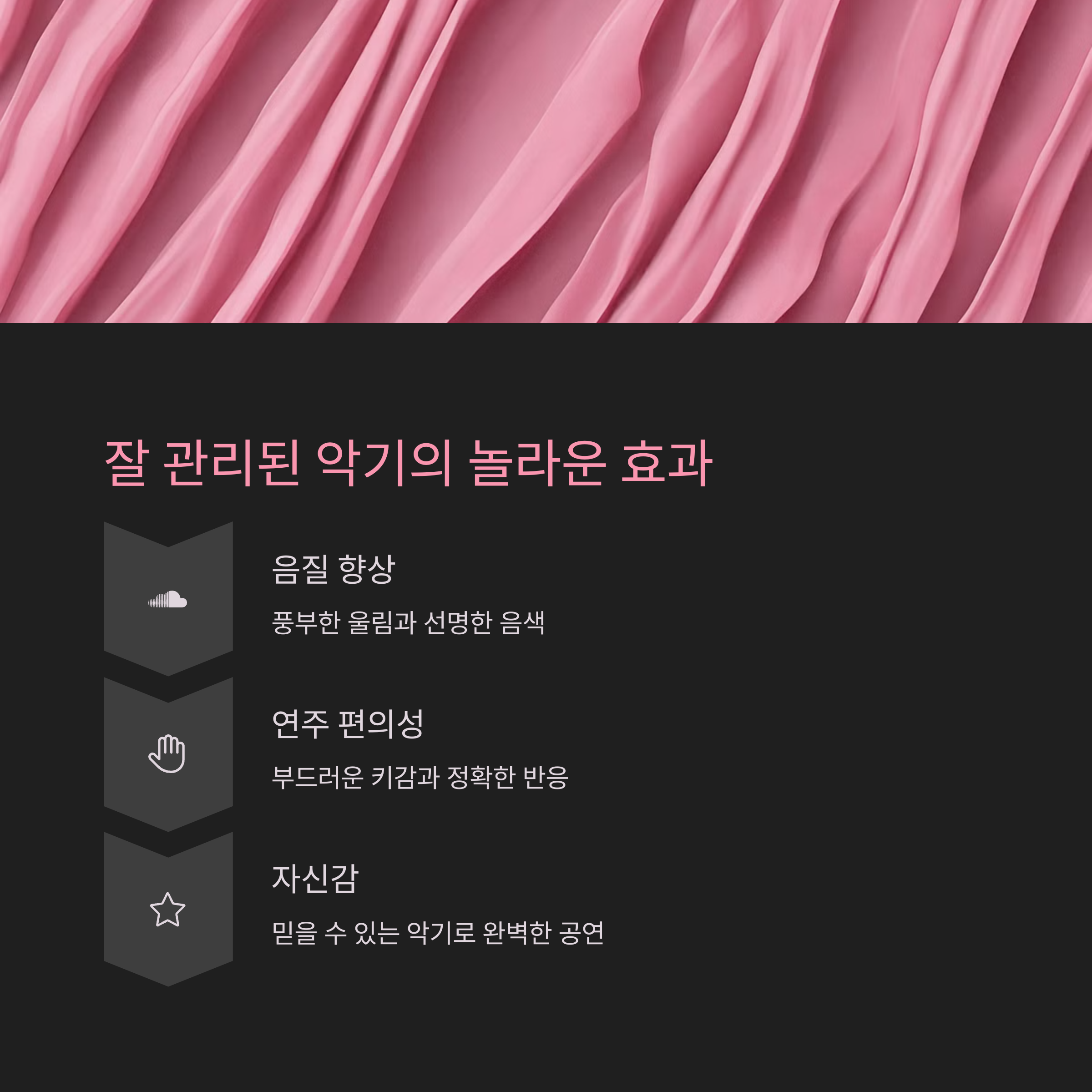 수리와 관리는 단순한 유지가 아닙니다. 이는 연주자의 표현력을 최대한 끌어올릴 수 있는 기초 체력 훈련이라고 볼 수 있습니다. 악기의 컨디션이 좋지 않으면 연주자는 기술적으로 불필요한 보정을 하게 되고, 이는 연주의 질에도 영향을 끼치게 됩니다. 따라서 전문가들은 연습만큼이나 악기 상태를 체크하는 시간도 꼭 투자하라고 강조합니다. 악기는 나에게 맞는 파트너입니다. 좋은 악기를 오래 사용하고 싶다면, 애정 어린 관리를 시작해 보세요.