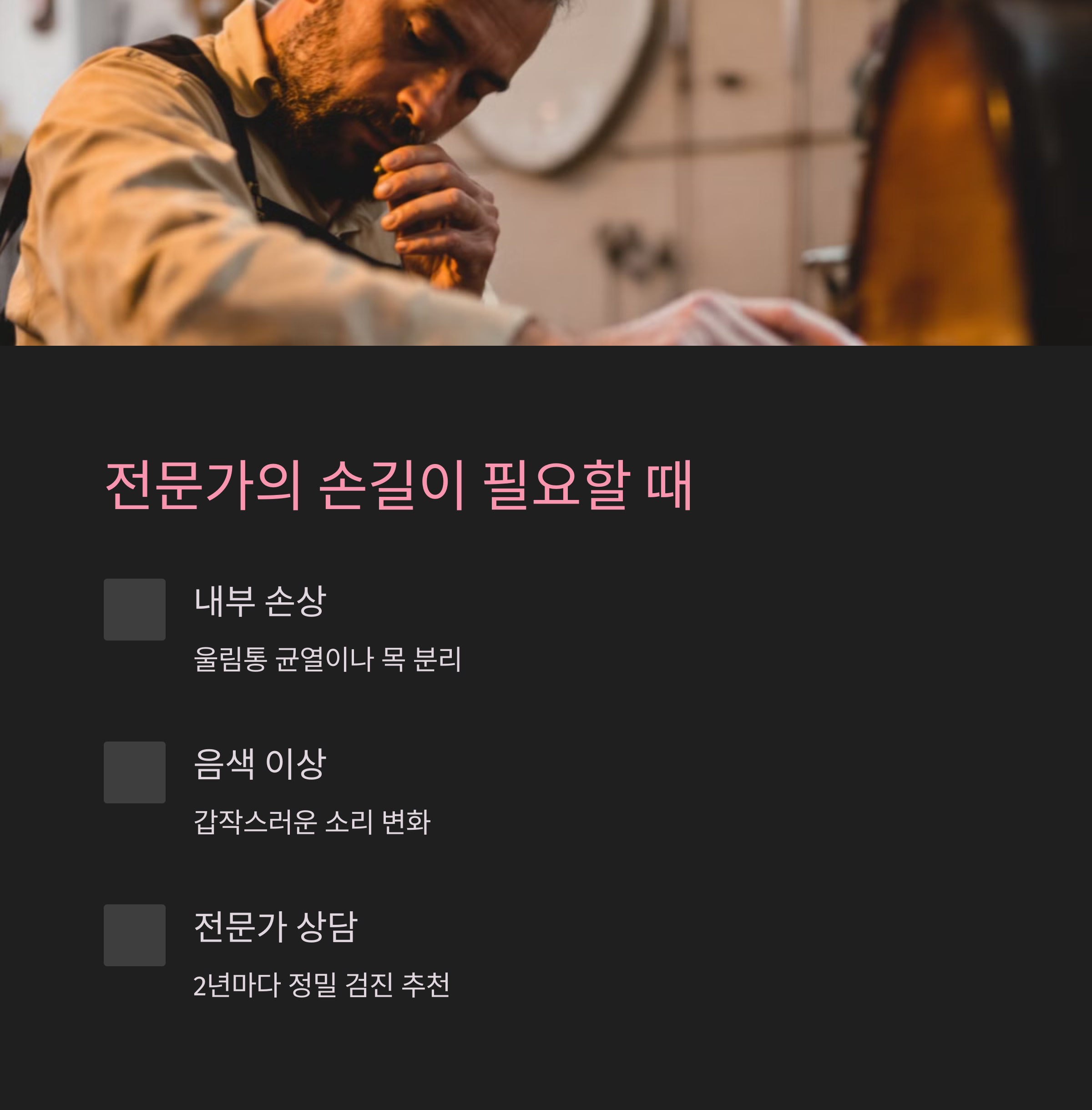 | 전문가 의뢰 타이밍 | 기능 이상, 내부 손상, 음색 변화 시 전문 수리가 필요합니다. |