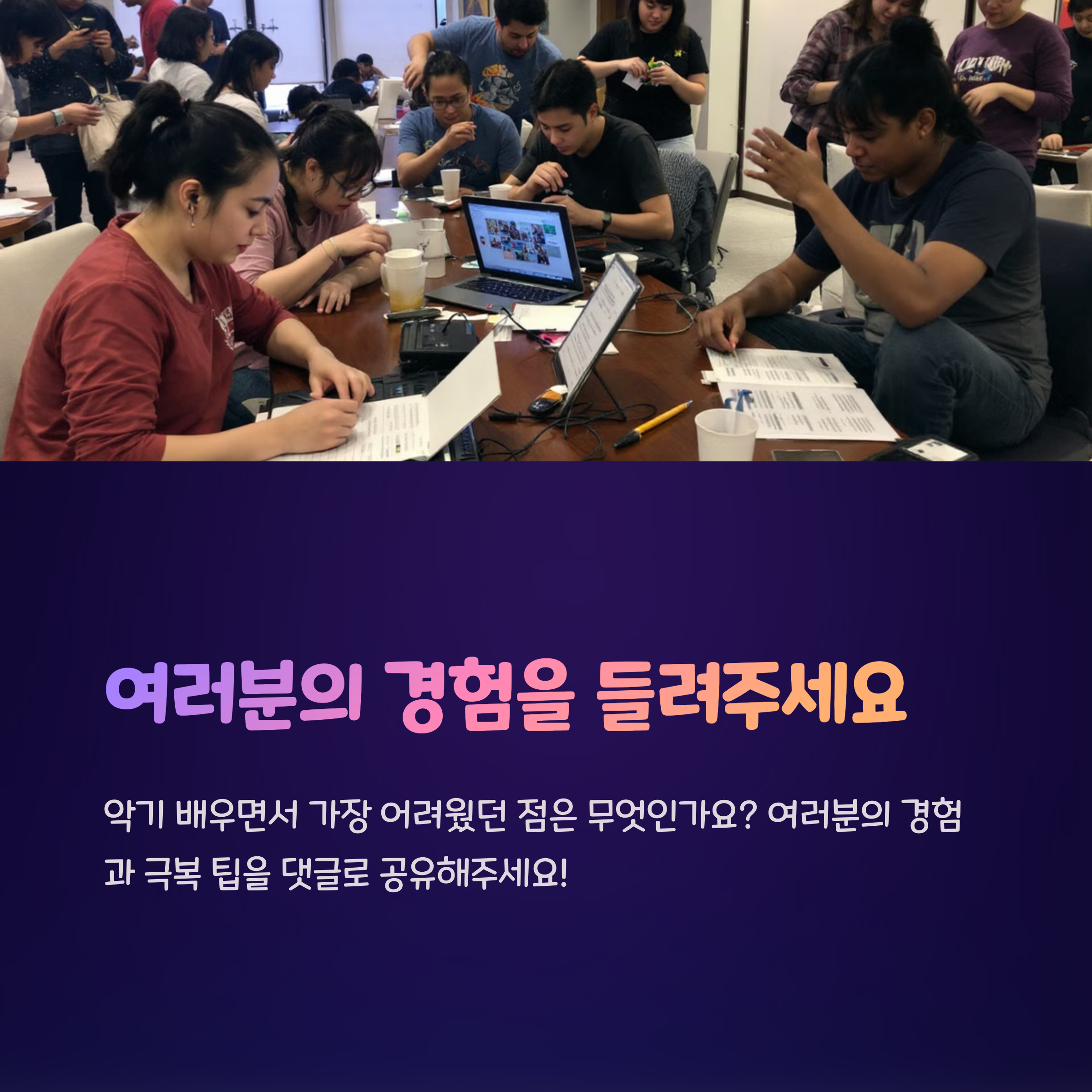 악기를 배우면서 가장 어려웠던 점은 무엇인가요? 또는, 도움이 되었던 팁이 있다면 댓글로 공유해주세요!