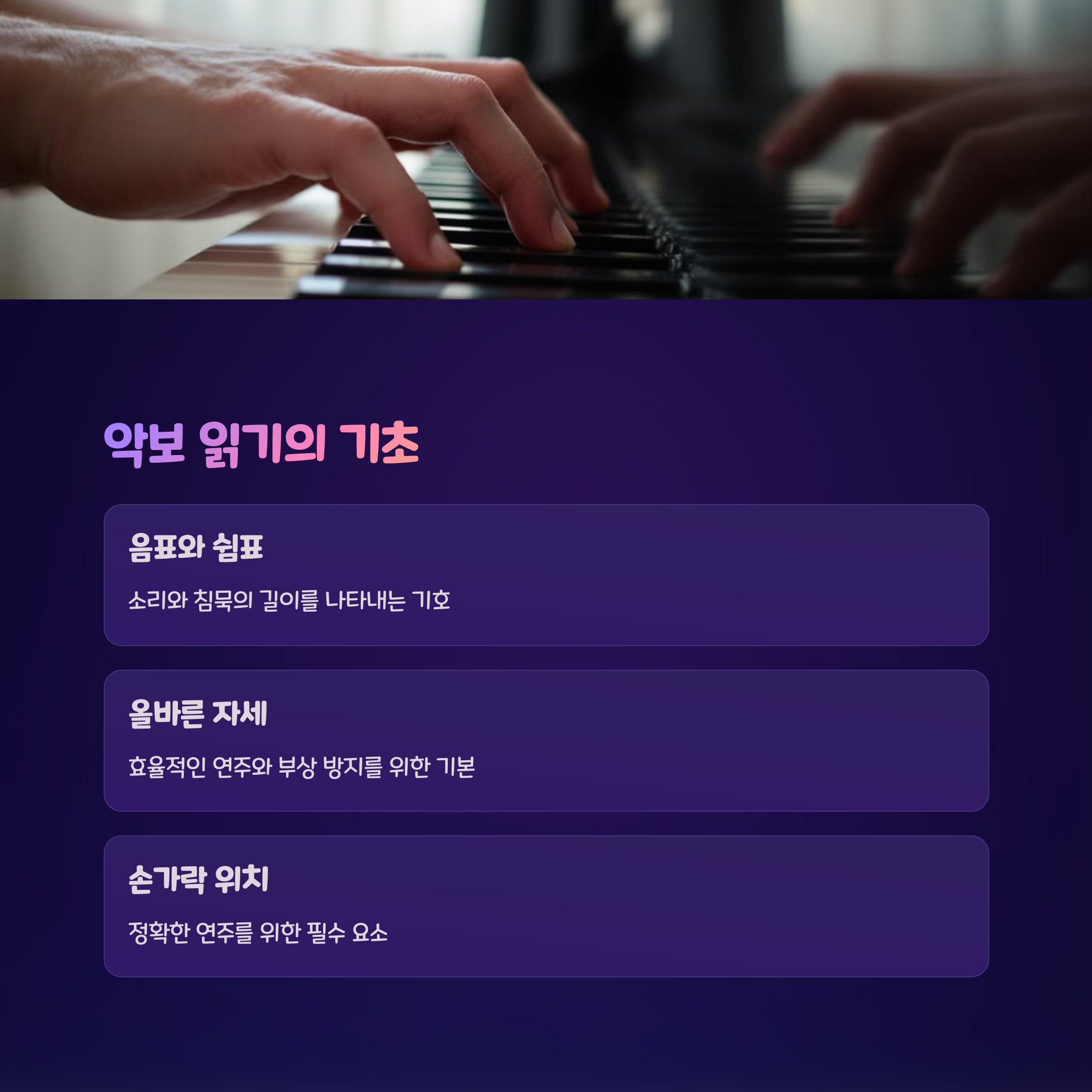 악보를 읽을 때 **음표(Note), 쉼표(Rest), 조표(Key Signature)**를 이해해야 합니다. 이 기호들은 연주할 때 필수적인 정보들을 제공합니다.