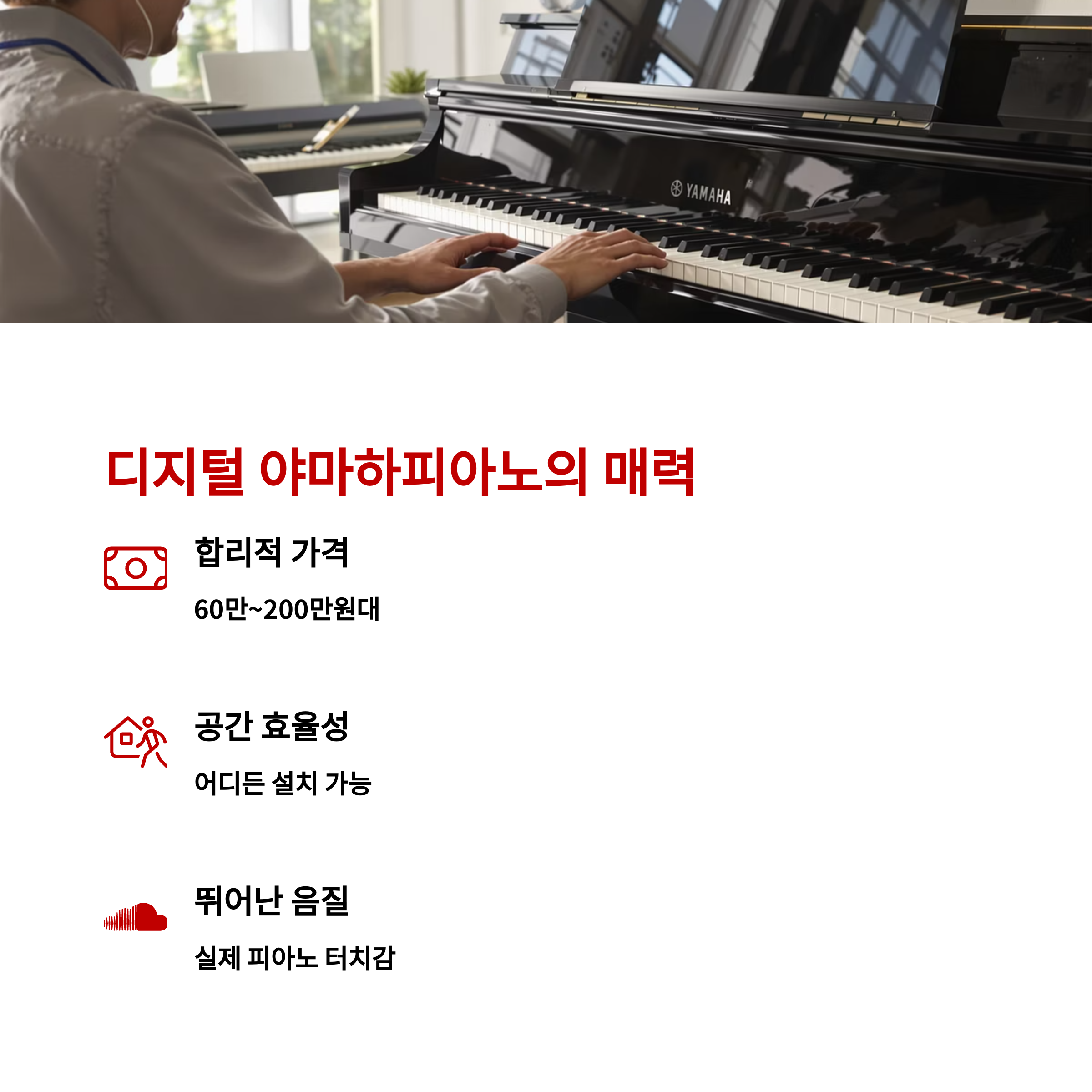 - 용도: 가정용, 연습실, 공연장 등 사용 목적에 따라 야마하피아노 모델을 선택하세요.